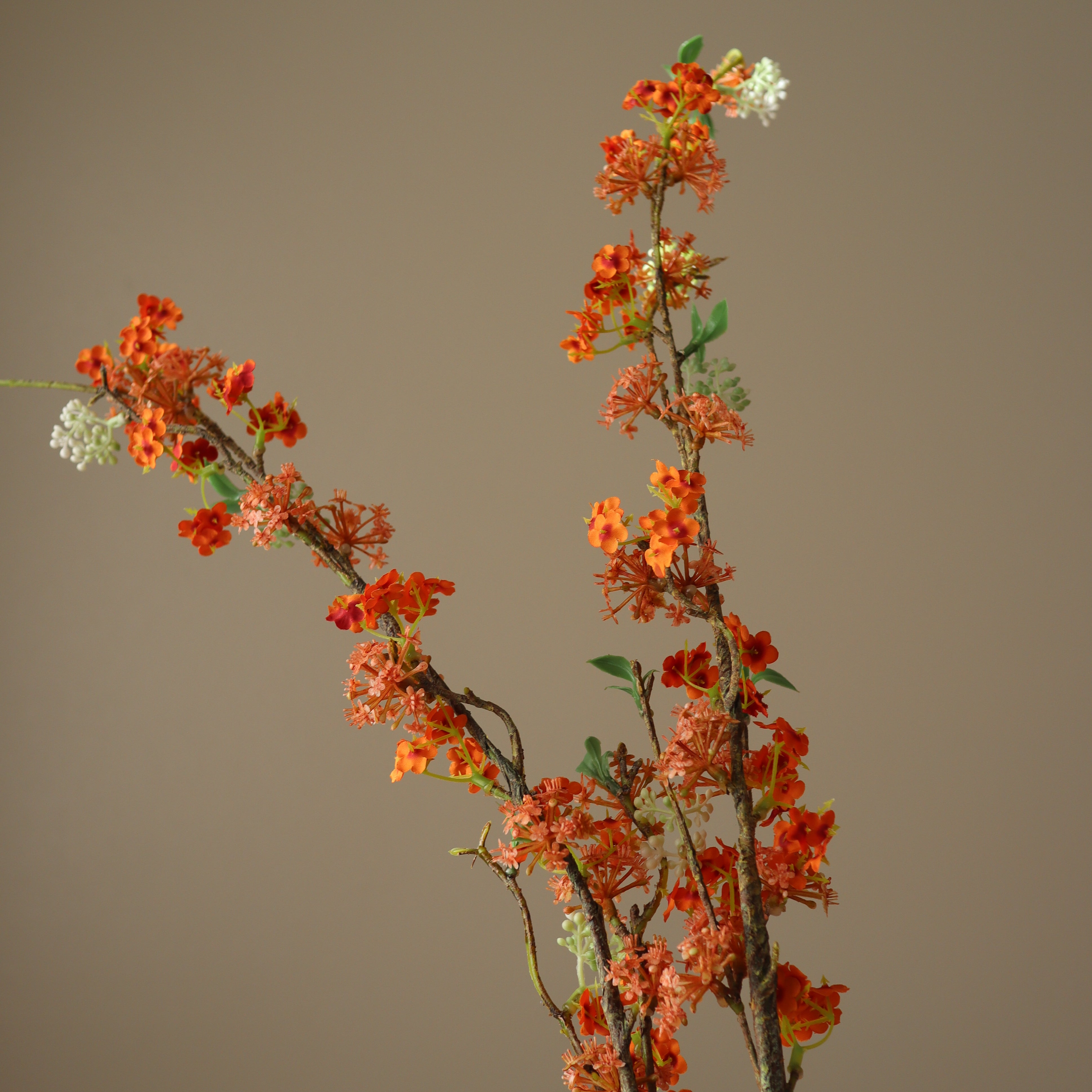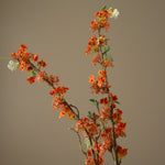 This Orange Snow Willow Branch features multiple clusters of small, delicate orange blossoms interspersed with tiny white floral accents. The flowers are arranged along a slender, branching stem with subtle green leaves. The blossoms have a soft, slightly ruffled texture, and the branch itself has a natural curvature. The stem reaches a height of 104 cm.