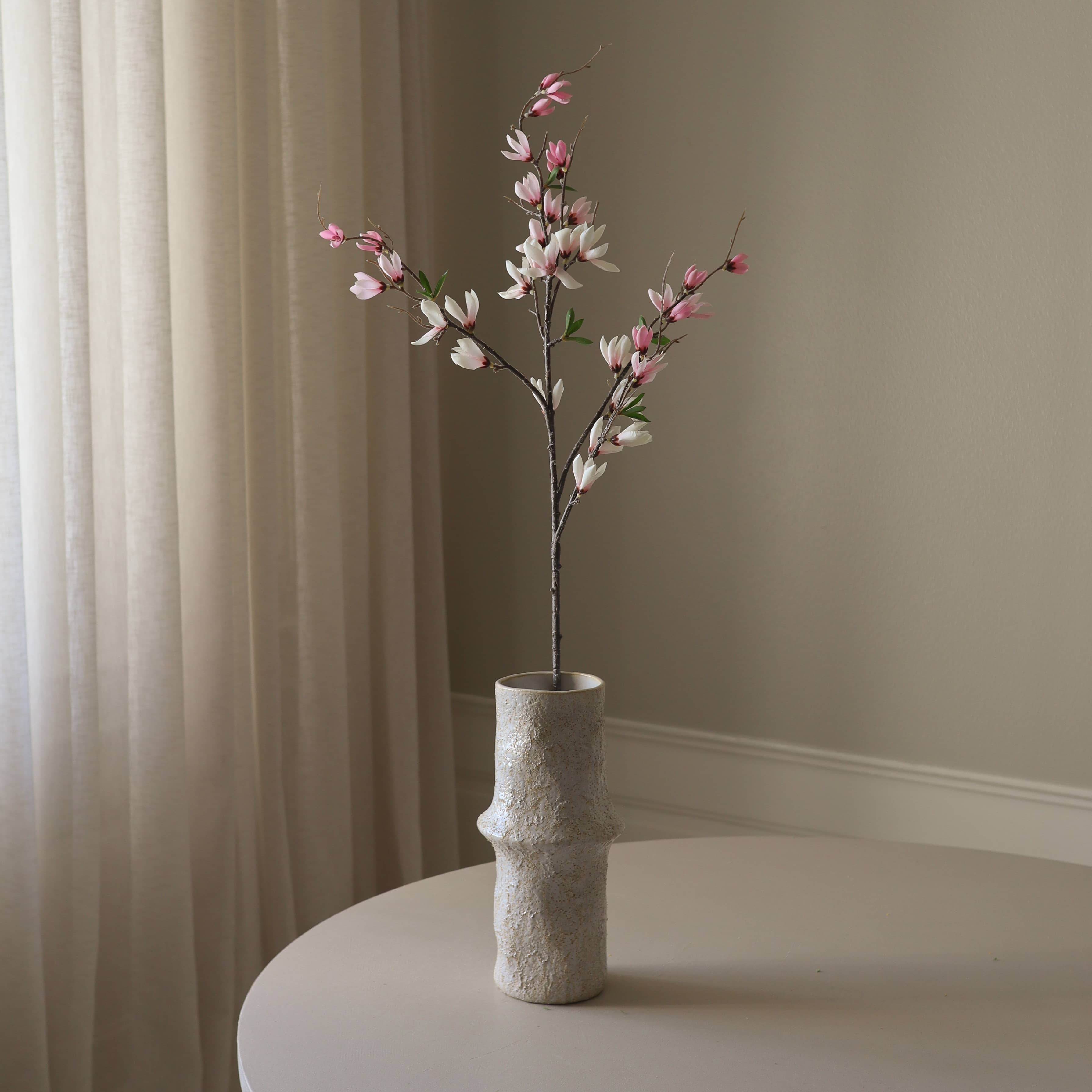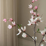 This Pink Star Magnolia Branch has multiple blossoms in soft pink and white along a textured brown stem. The flowers vary in size, with some still in bud form and others fully open. Small green leaves are placed along the branches. The slender, slightly curved stem reaches a height of 95 cm.