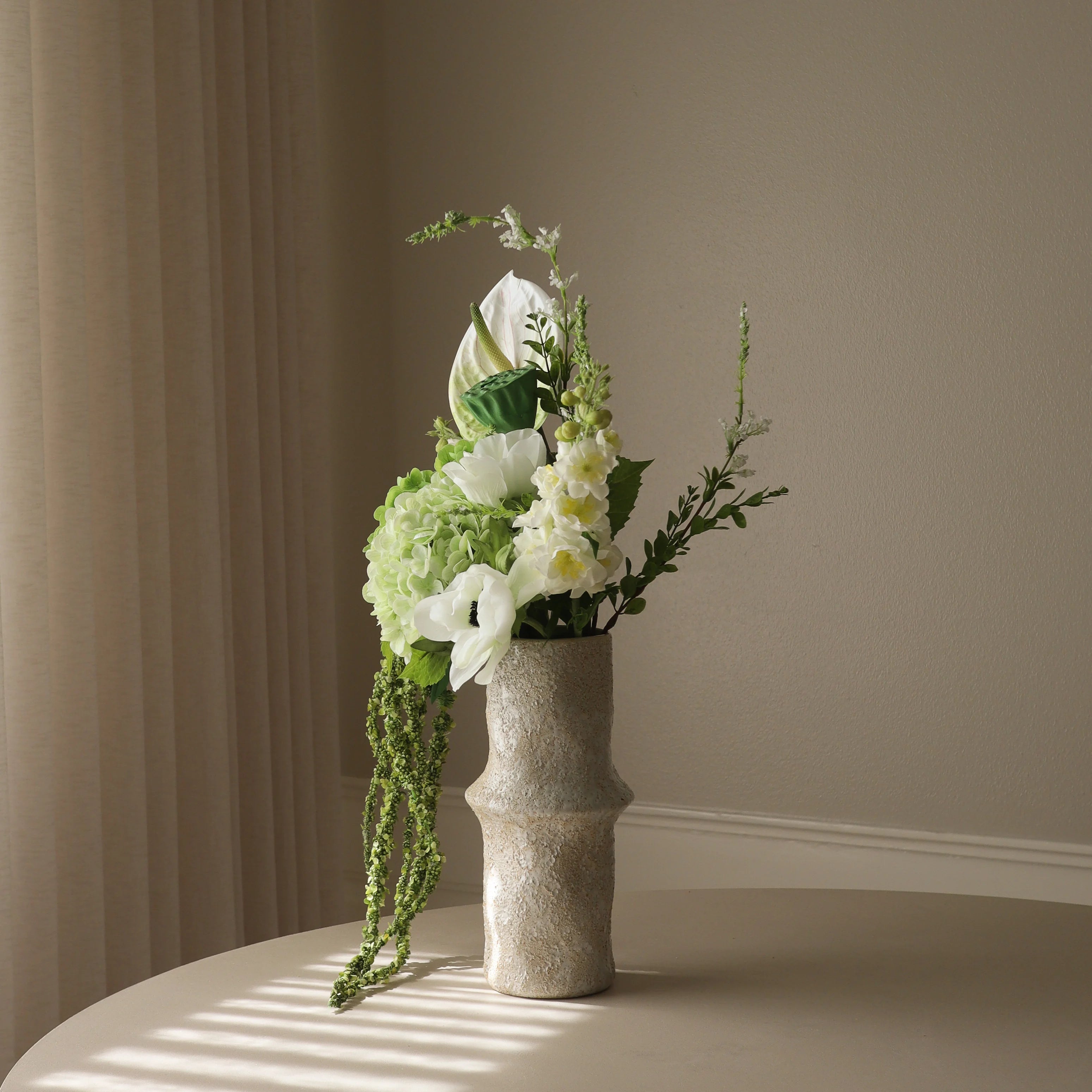 This bouquet features a refined mix of soft greens and crisp whites, creating an elegant and balanced composition. Lush hydrangea blooms provide volume, while delicate anemones and structured foxtail lilies add texture and height. A sculptural anthurium and lotus seedpod introduce subtle contrast, while cascading amaranthus adds graceful movement.