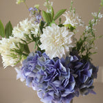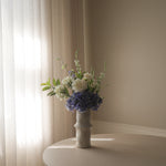 This bouquet captures the essence of a cool summer morning, blending soft white florals with deep blue hydrangeas. The delicate wildflowers and dahlia add a light, airy touch, while the agapanthus and cosmo daisies bring a fresh contrast. Jasmin leaves introduce a natural flow, complemented by the wispy blue snow willow branch.