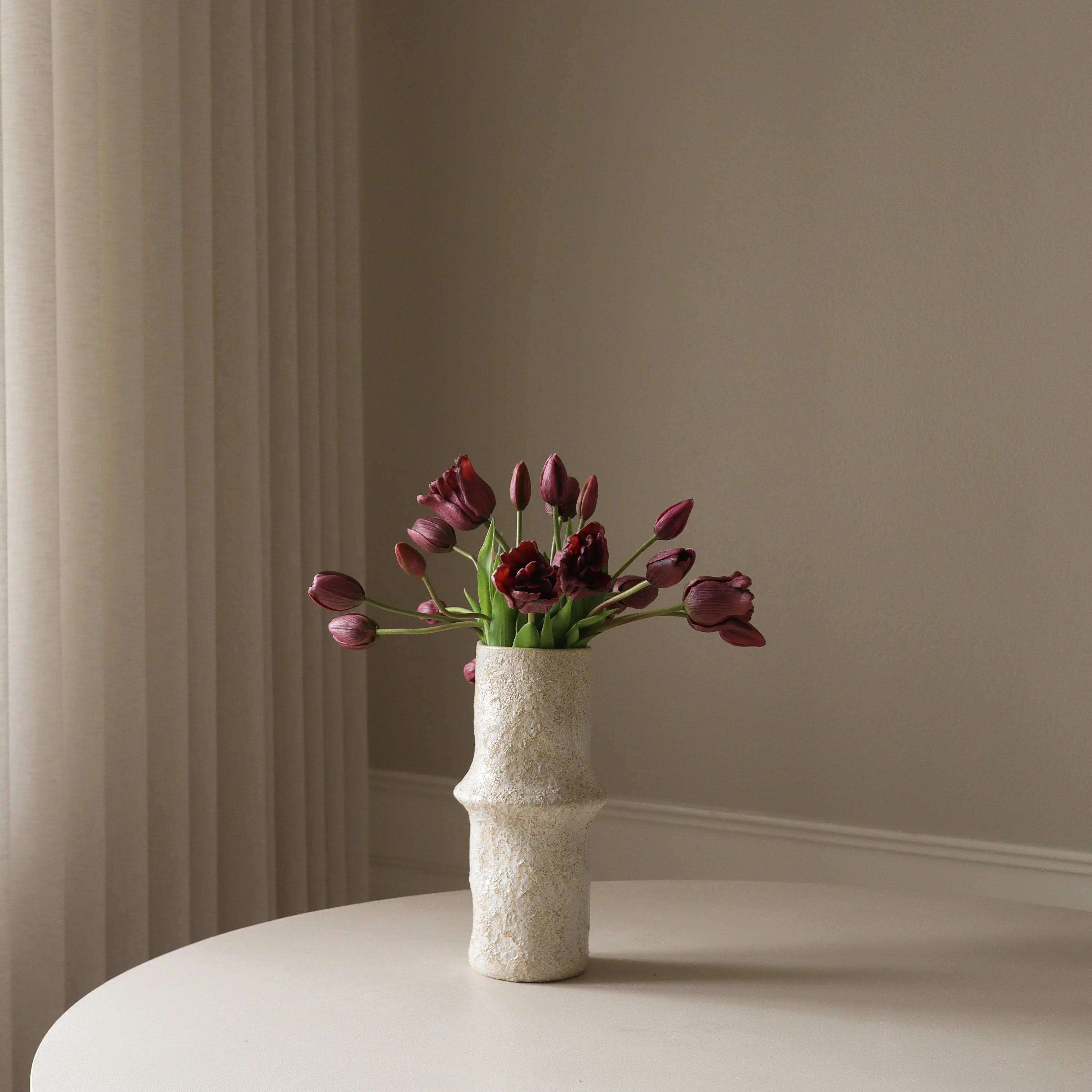 This bouquet showcases deep burgundy tulips with gracefully arching stems and lush green leaves. The structured yet natural arrangement highlights the rich hues of the blossoms, adding depth and elegance. The bouquet reaches a height of 44 cm at its tallest point, but all stems can be easily bent and adjusted to achieve the desired height and shape for any arrangement.