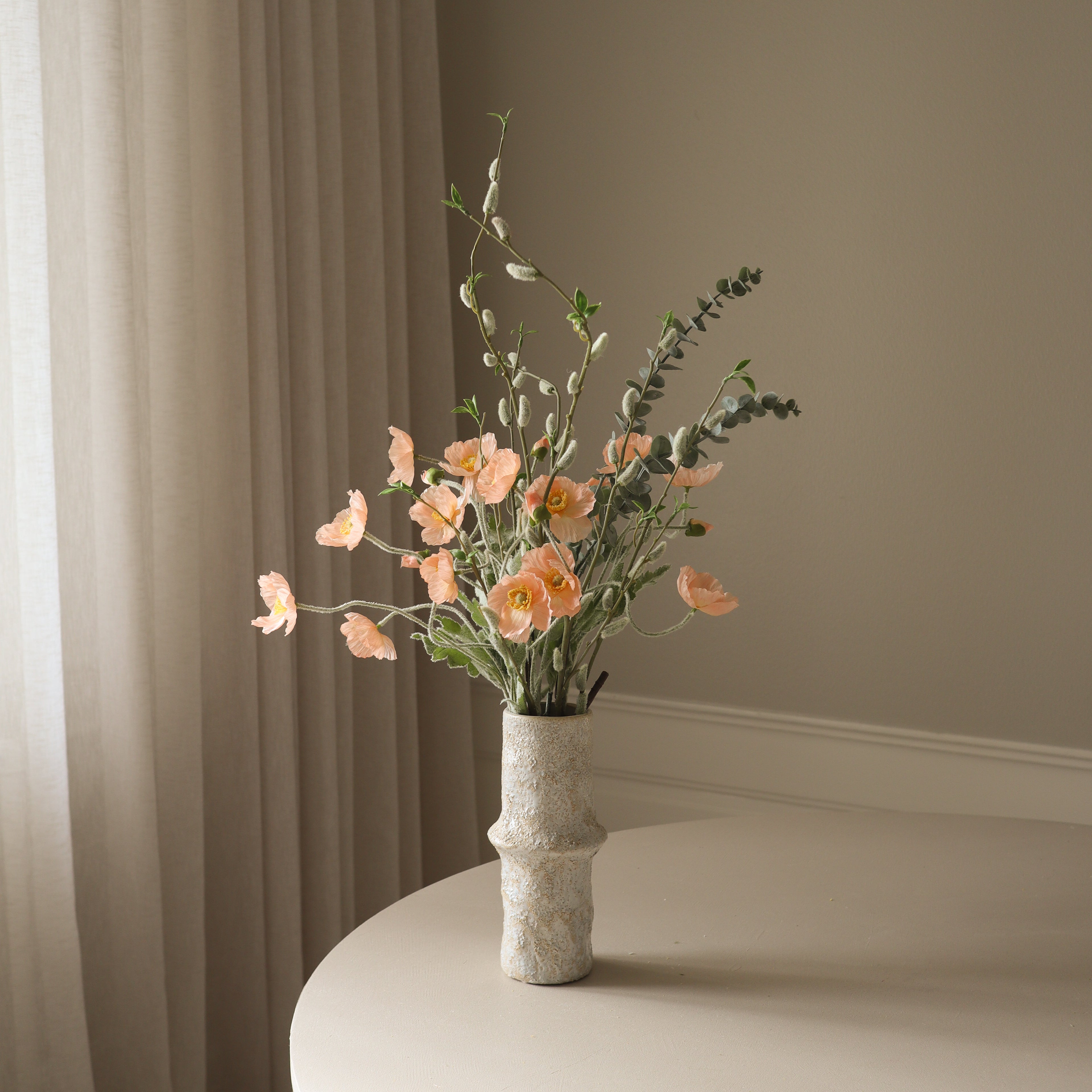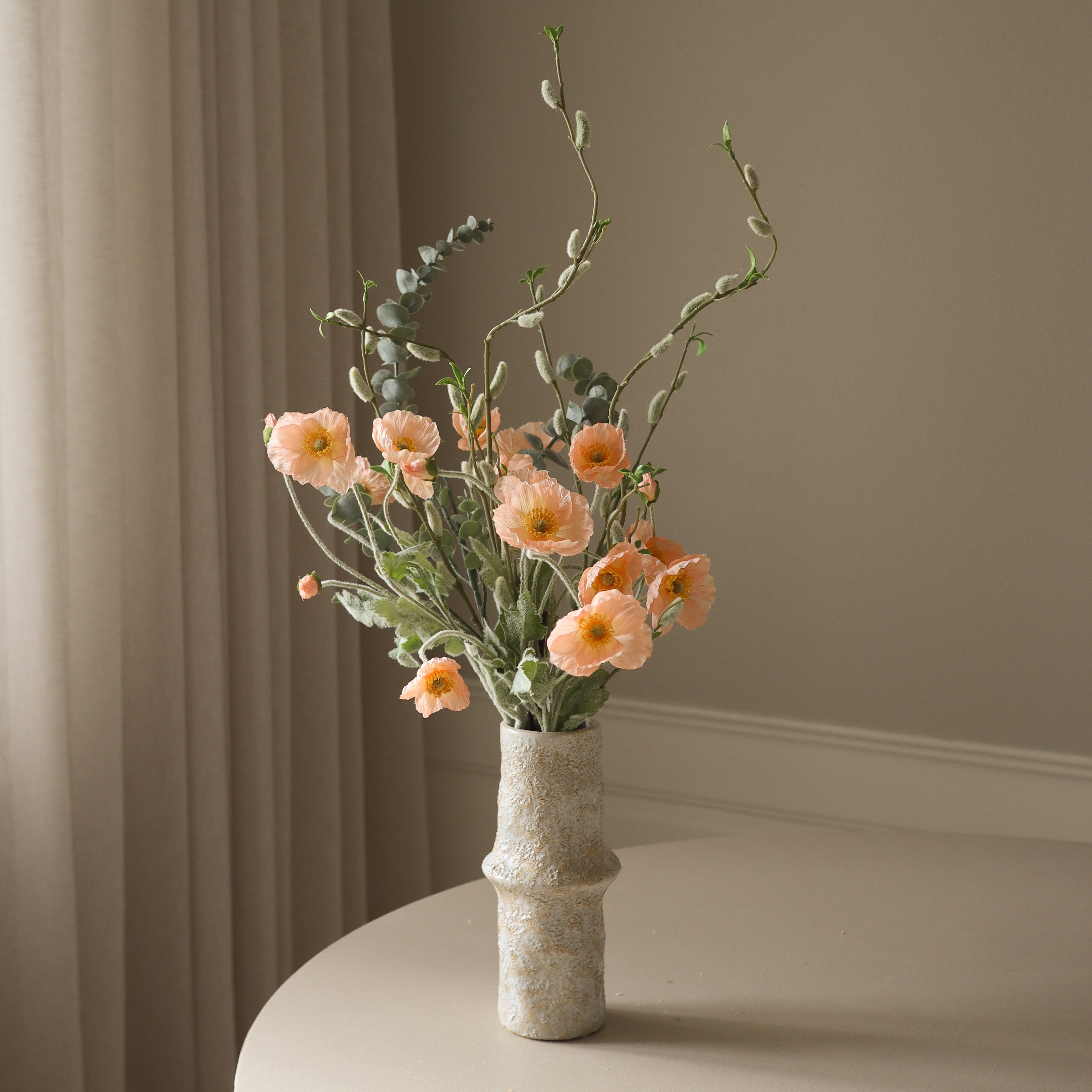 This arrangement blends soft coral hues with delicate organic movement.The coral poppies, with their gently ruffled petals, add a warm, airy presence, while the curved willow bud branches lend an elegant, sculptural quality. A touch of green eucalyptus introduces a subtle contrast, completing the bouquet’s natural balance.
