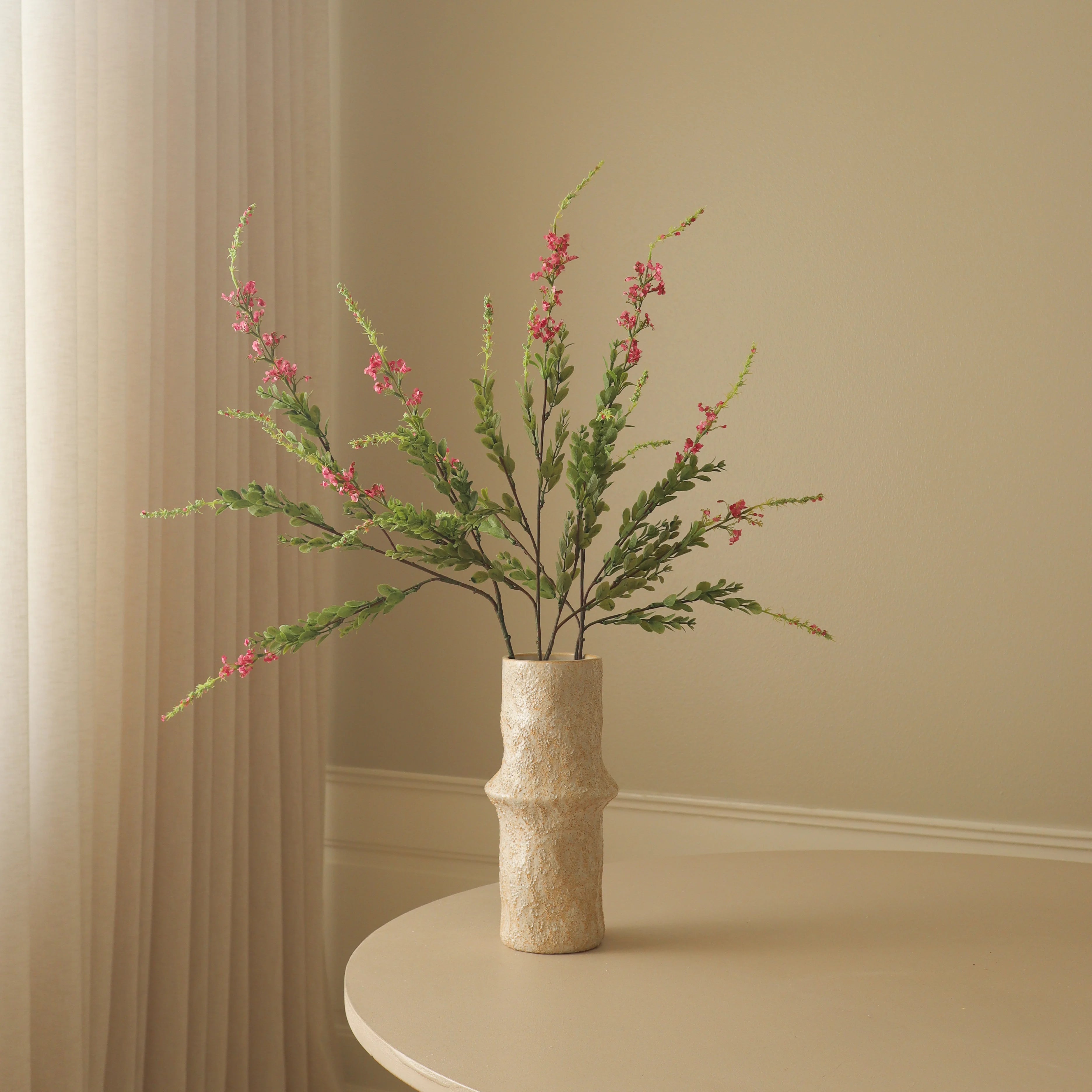 This Pink Wild Flower features delicate clusters of small blossoms in varying shades of pink, arranged along slender, branching green stems. The stems measure 84 cm in height, with a natural structure that allows them to be positioned in different ways to complement various arrangements. Small green leaves and buds extend along the length of the stems, adding a balanced and organic appearance.