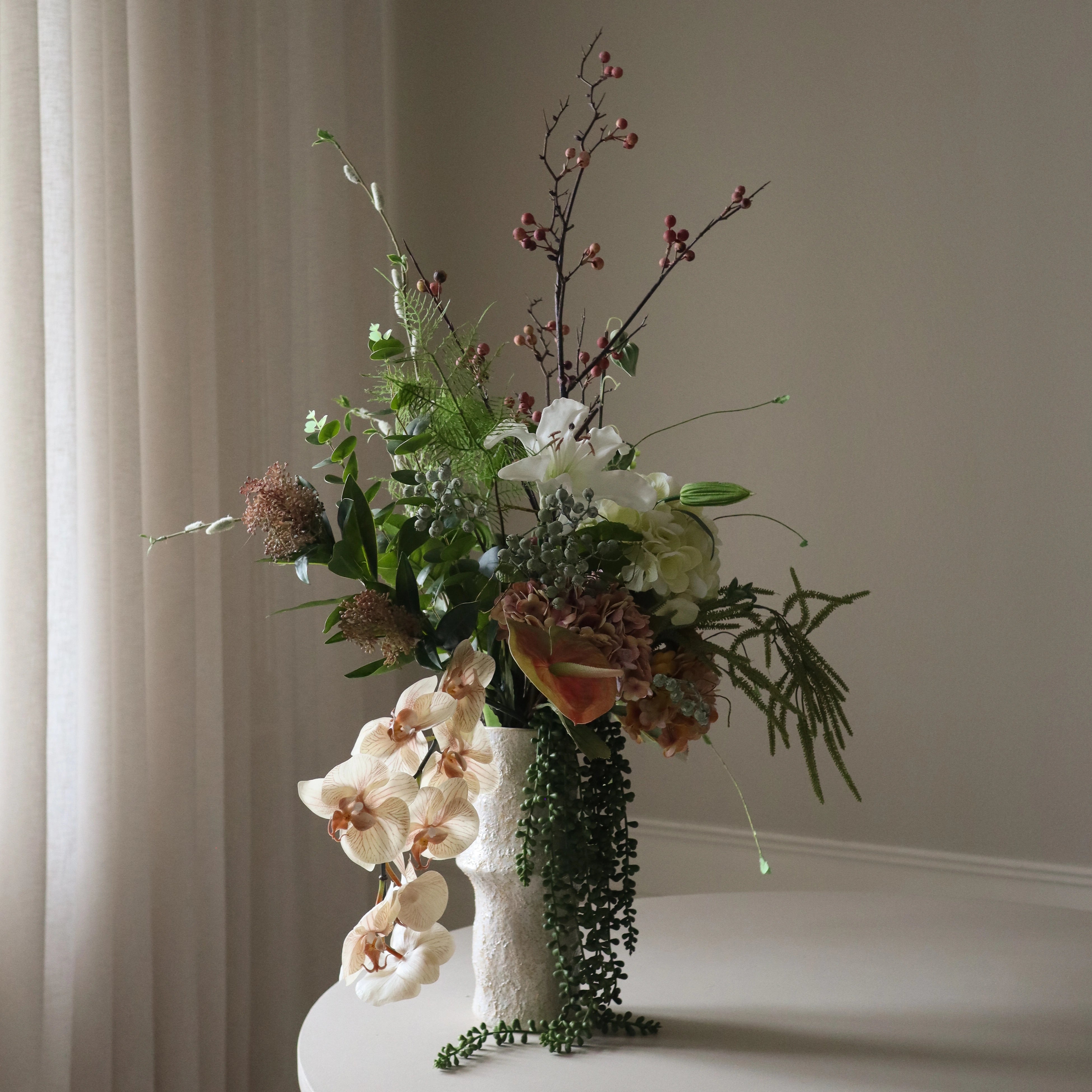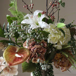 This arrangement features a rich blend of textures and soft, natural tones. A combination of white lily and hydrangea provides a lush foundation, while the warm hues of pink anthurium, rose hydrangea, and orange hydrangea add depth. The trailing greenery of hanging willow and ruby necklace succulent stems introduces a cascading effect, complemented by the structured presence of parvifolia eucalyptus leaves and skimmia berry branches.