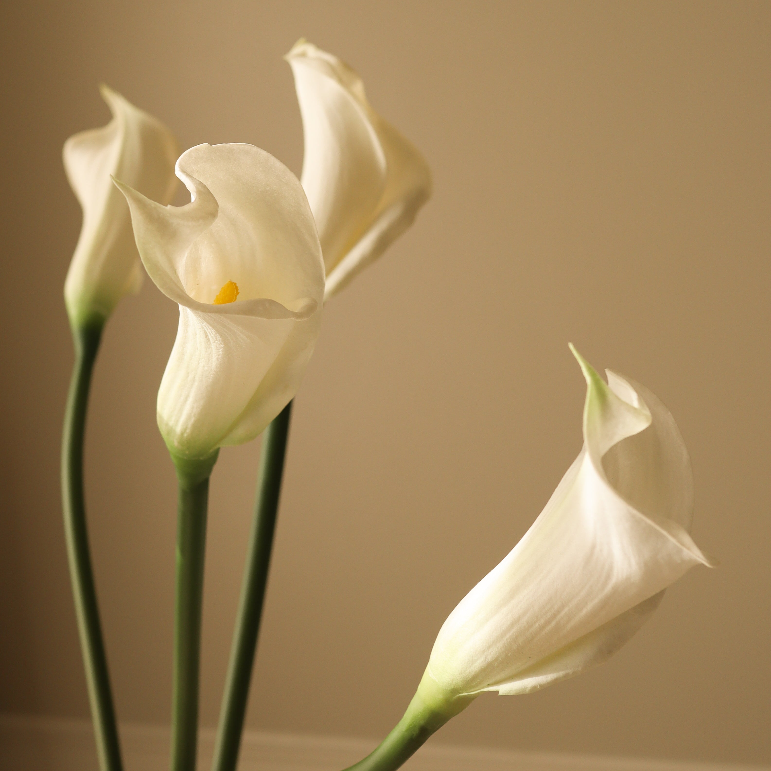 This White Calla Lily Flower has a very detailed design. The single flower head displays a pure white, trumpet-shaped bloom with a smooth, velvety texture, complemented by a soft yellow spadix nestled at its center. The stem measures 45 cm in length..