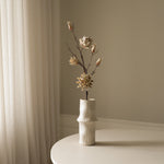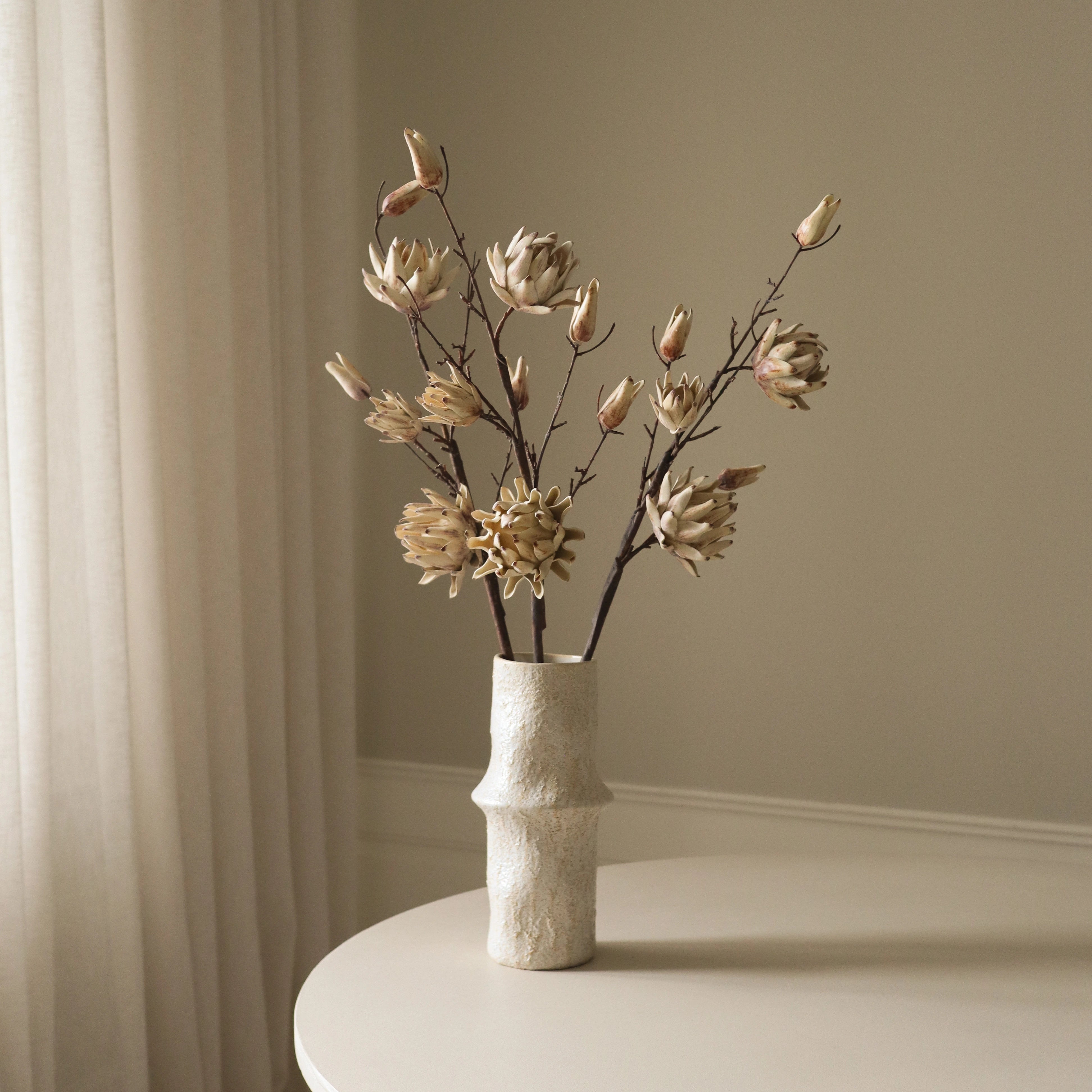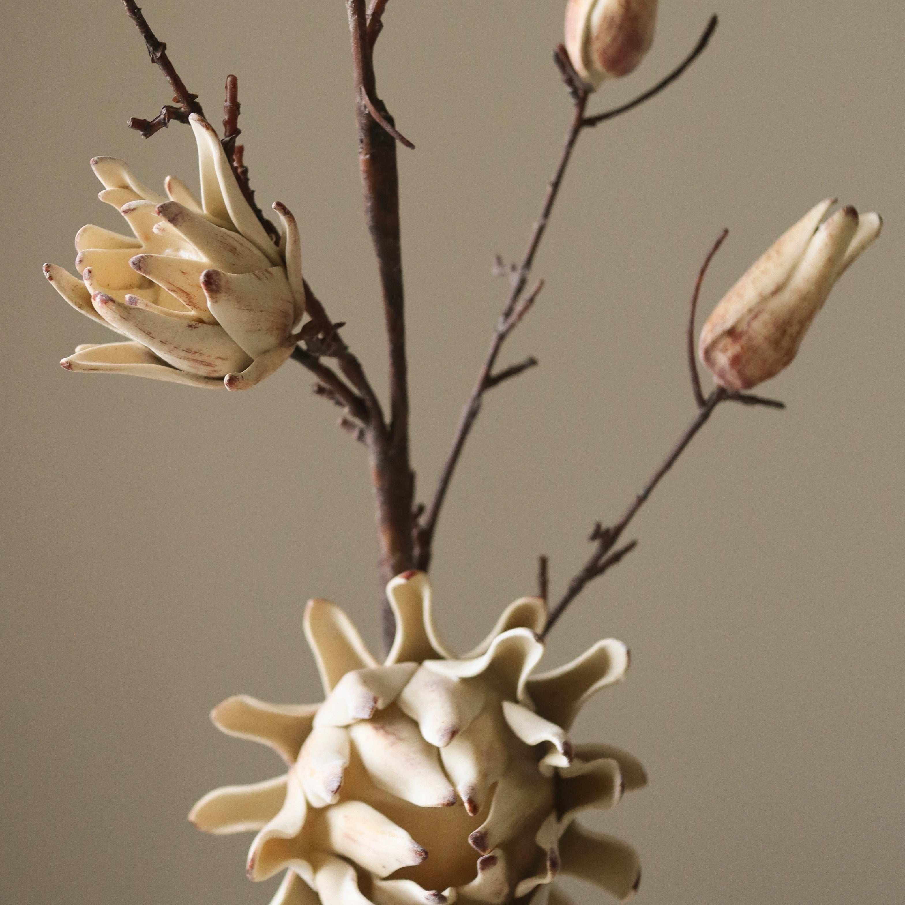 This Cream Artichoke Branch features multiple textured blooms in a soft cream hue with subtle brown undertones. The sculptural petals and detailed buds create a distinctive appearance. The dark brown stem has a slightly rough texture, enhancing the natural aesthetic. The stem measures 80 cm in height.