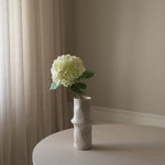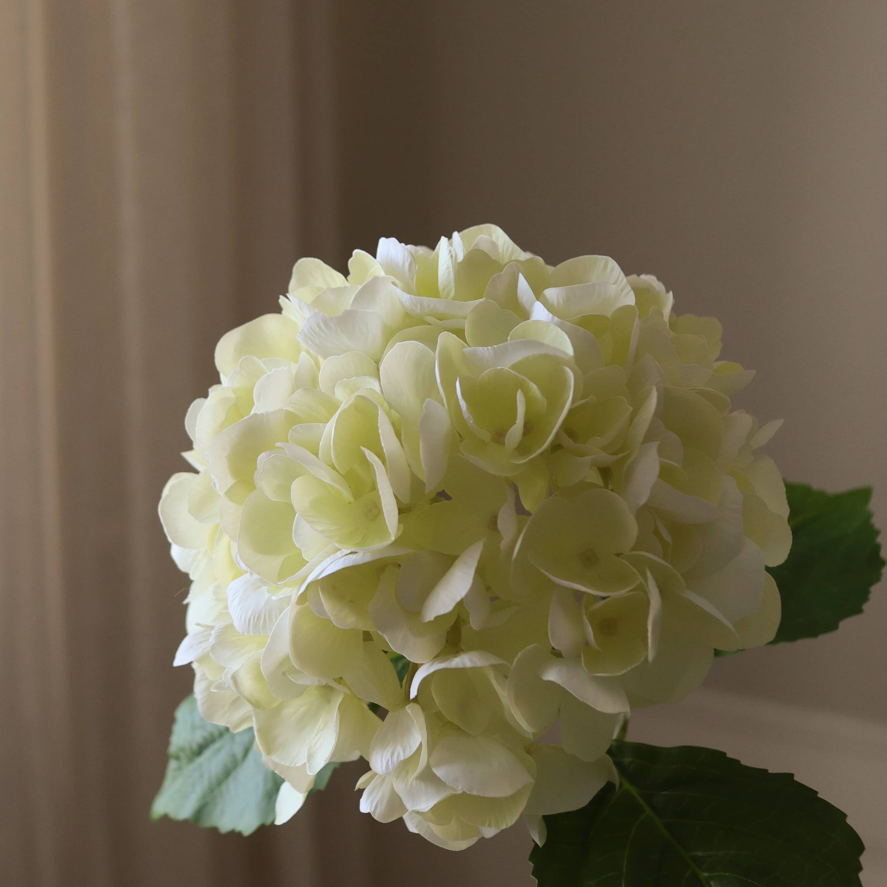 This Cream Hydrangea Flower features a full, rounded bloom with delicately layered petals in soft cream tones. The petals display subtle variations in shading, adding depth to the cluster. Supported by a sturdy green stem, the flower is accompanied by broad, veined leaves in a deep green hue. The stem measures 55 cm in height.