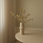 This White Eucalyptus Leaf features two slender stems with muted white-green leaves, each displaying a soft, smooth texture with hints of earthy tones. The leaves are arranged in an alternating pattern, accompanied by small, round buds near the tips, giving the stems a natural and airy structure. The stems measure 64 cm in height.