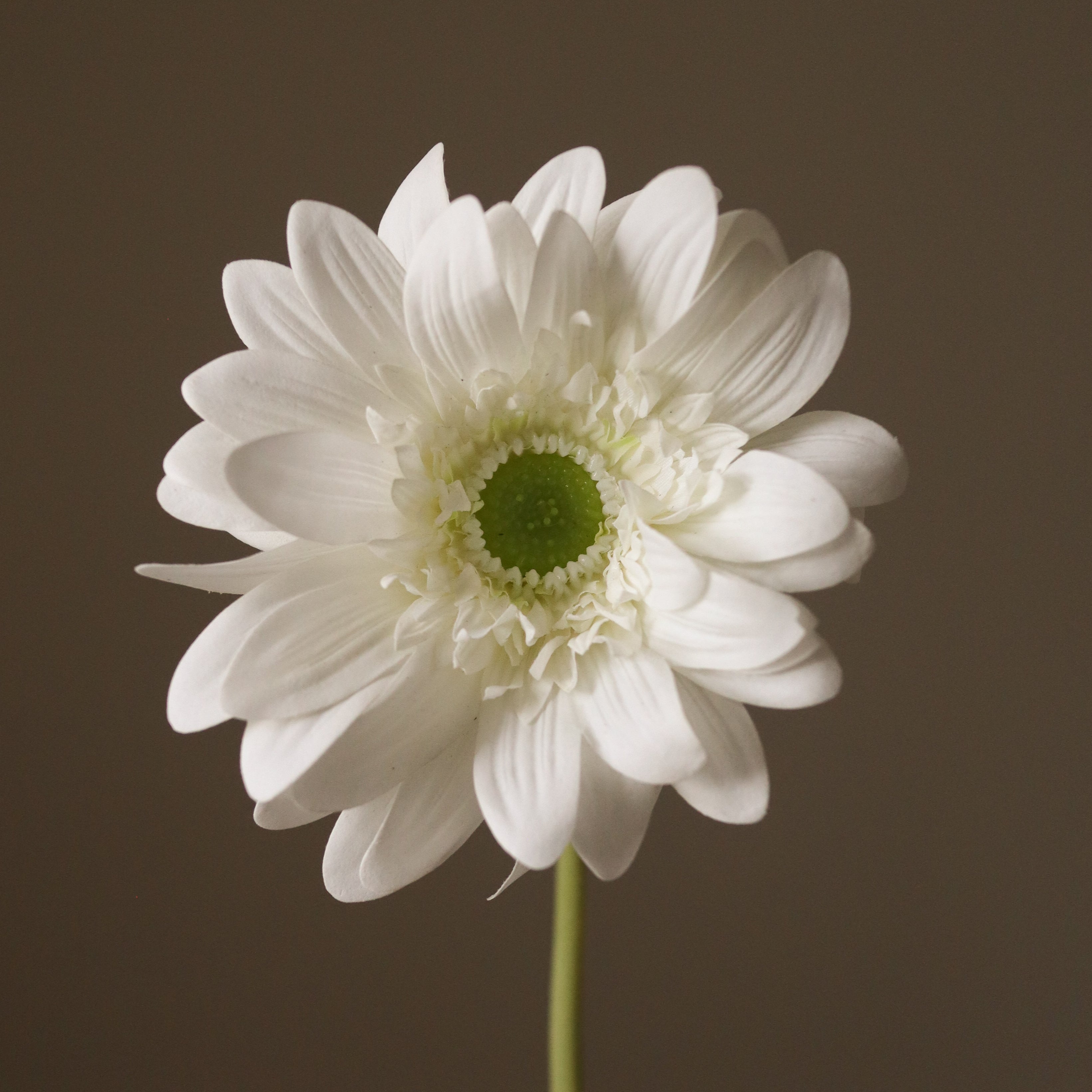 This White Gerbera Daisy Flower features a large, open bloom with pristine white petals radiating around a vibrant green center. The petals have a gently curved shape and a soft, structured texture, creating a striking visual contrast. The flower is supported by a slender, smooth green stem that measures 65 cm in height.