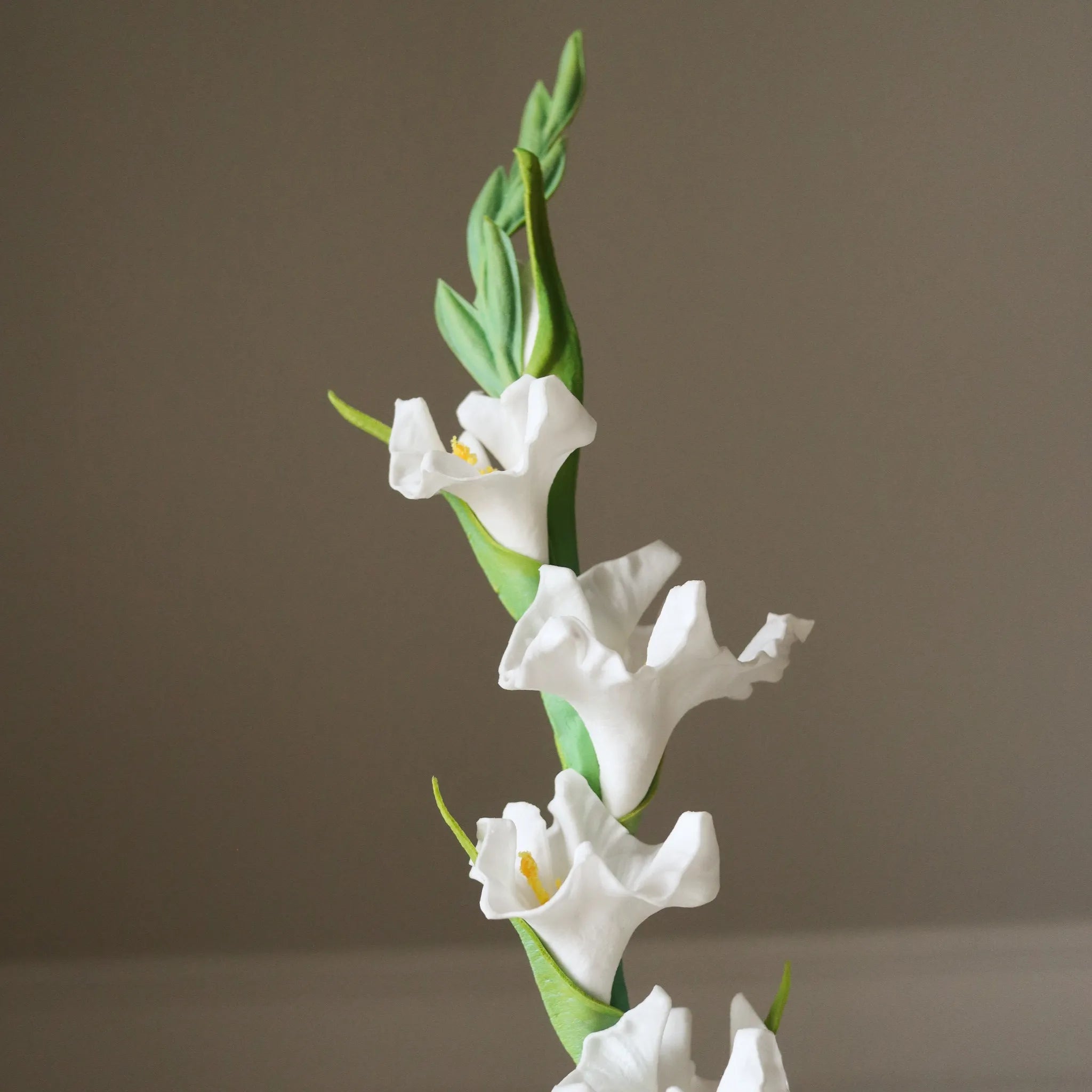 This White Gladiolus Flower displays a vertical arrangement of five soft, trumpet-shaped blooms in pure white, each with delicate yellow centers. The stem reaches a height of 53 cm.