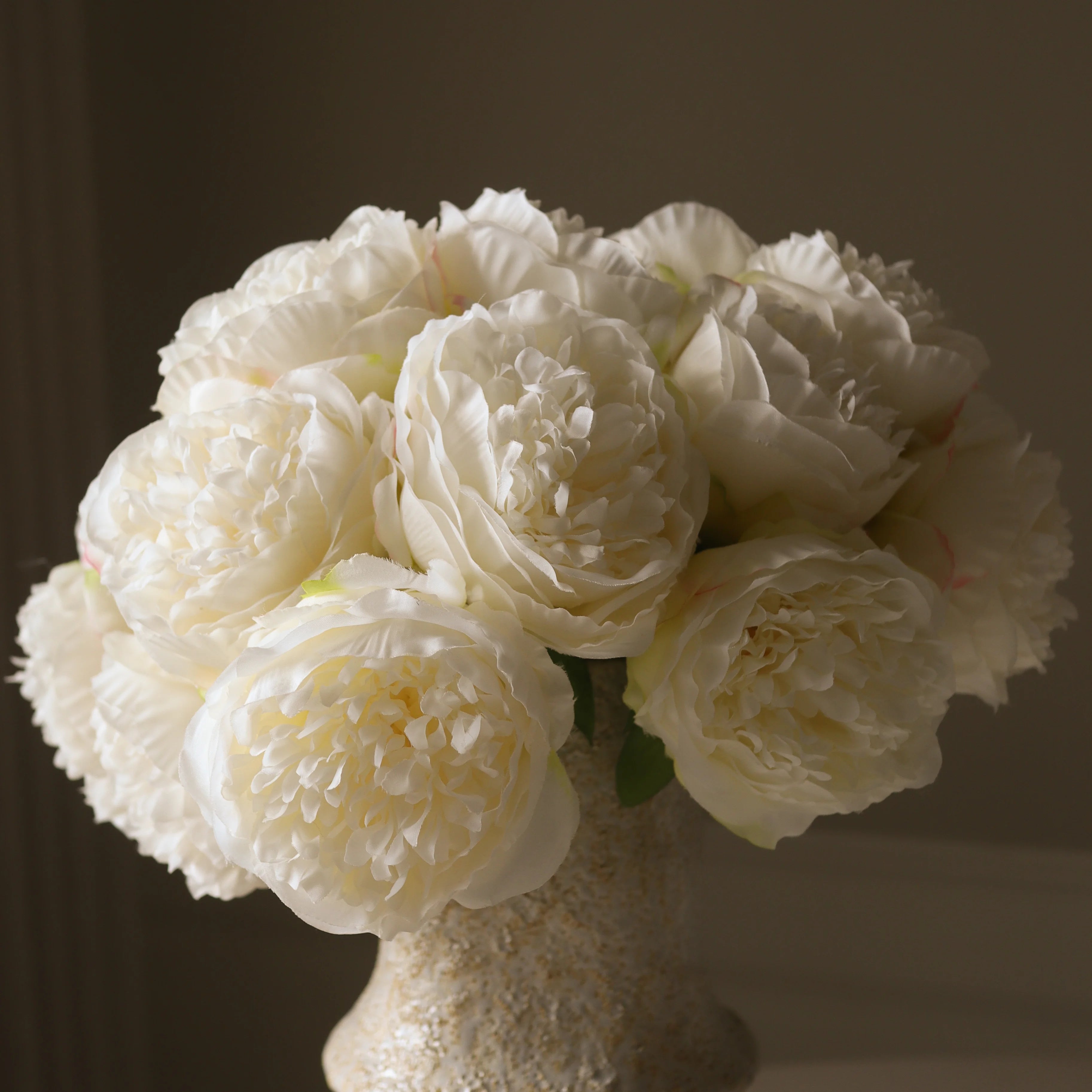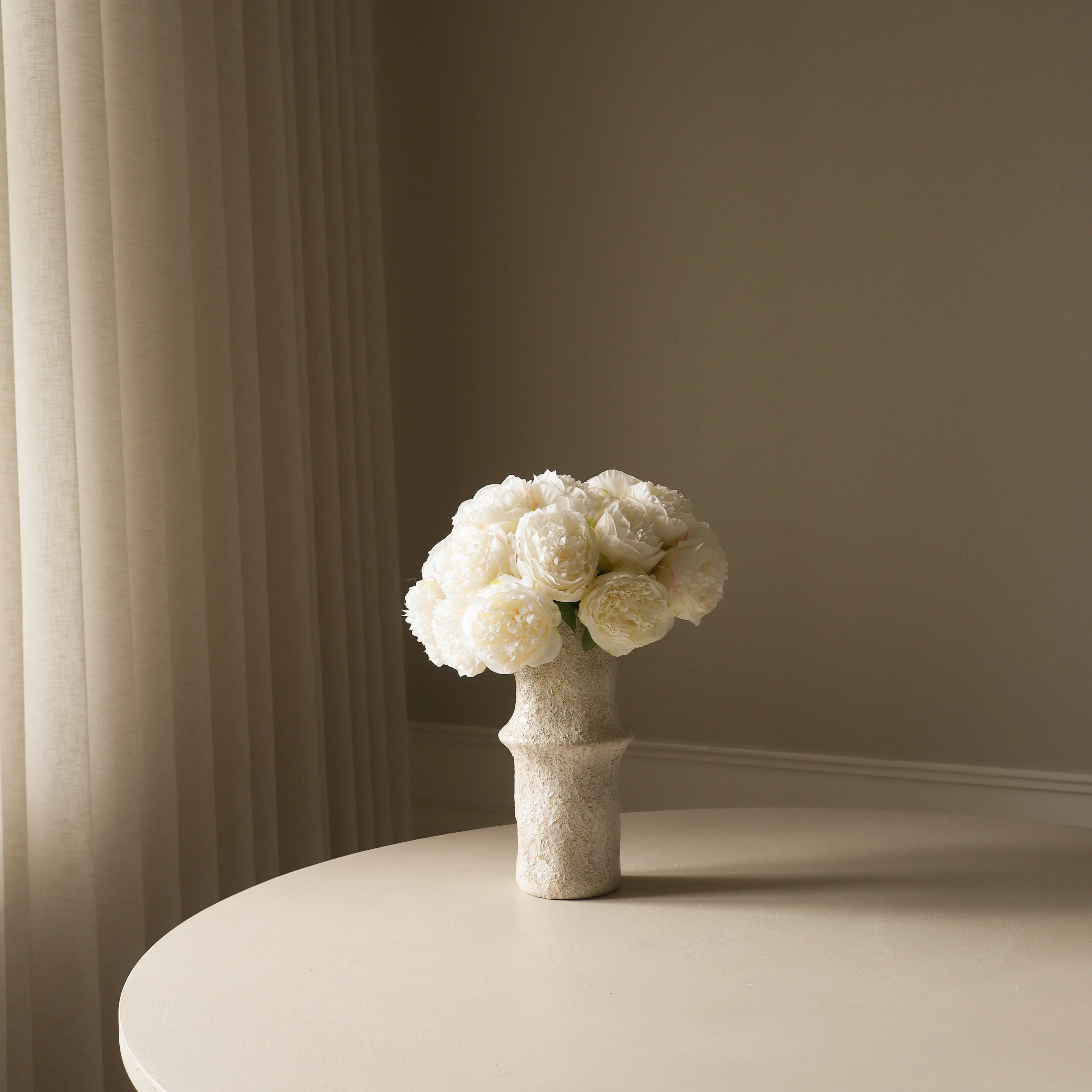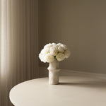 This arrangement features a soft and compact composition, blending delicate white petals with a rounded, full-bodied structure. The blooms are arranged in a tight, harmonious cluster, creating an elegant and refined display. Subtle textural variations and the gentle curve of each stem contribute to a timeless and sophisticated aesthetic, making this bouquet a versatile accent for any setting.