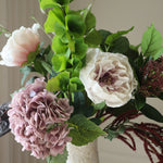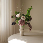 This bouquet features a refined mix of deep, muted tones and soft textures, creating a balanced yet dramatic composition. Lush blooms contrast with sculptural foliage, while trailing elements add a sense of movement and dimension.