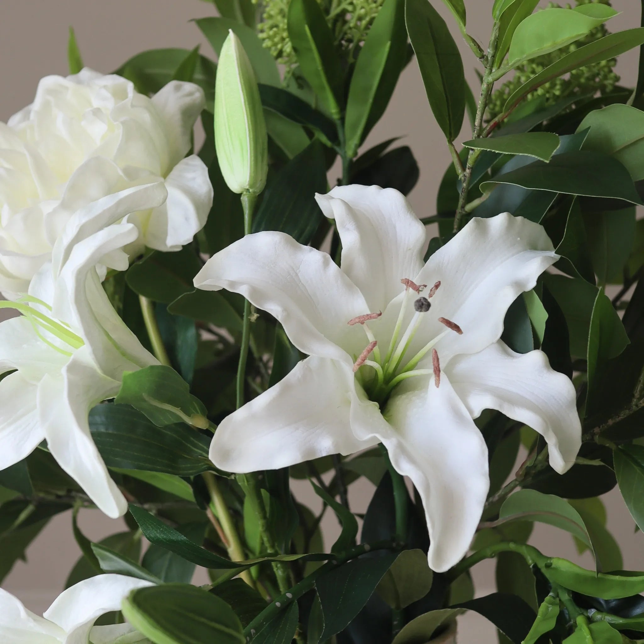 This bouquet features a balanced composition of crisp white blooms and lush greenery, creating a refined and serene arrangement. The structured foliage provides depth, while delicate flowers add softness and movement.