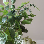 This bouquet features a striking combination of cascading blooms and textured greenery, creating a lush and sophisticated arrangement. The organic mix of soft petals, structured leaves, and trailing elements adds depth and movement, making it a captivating statement piece.