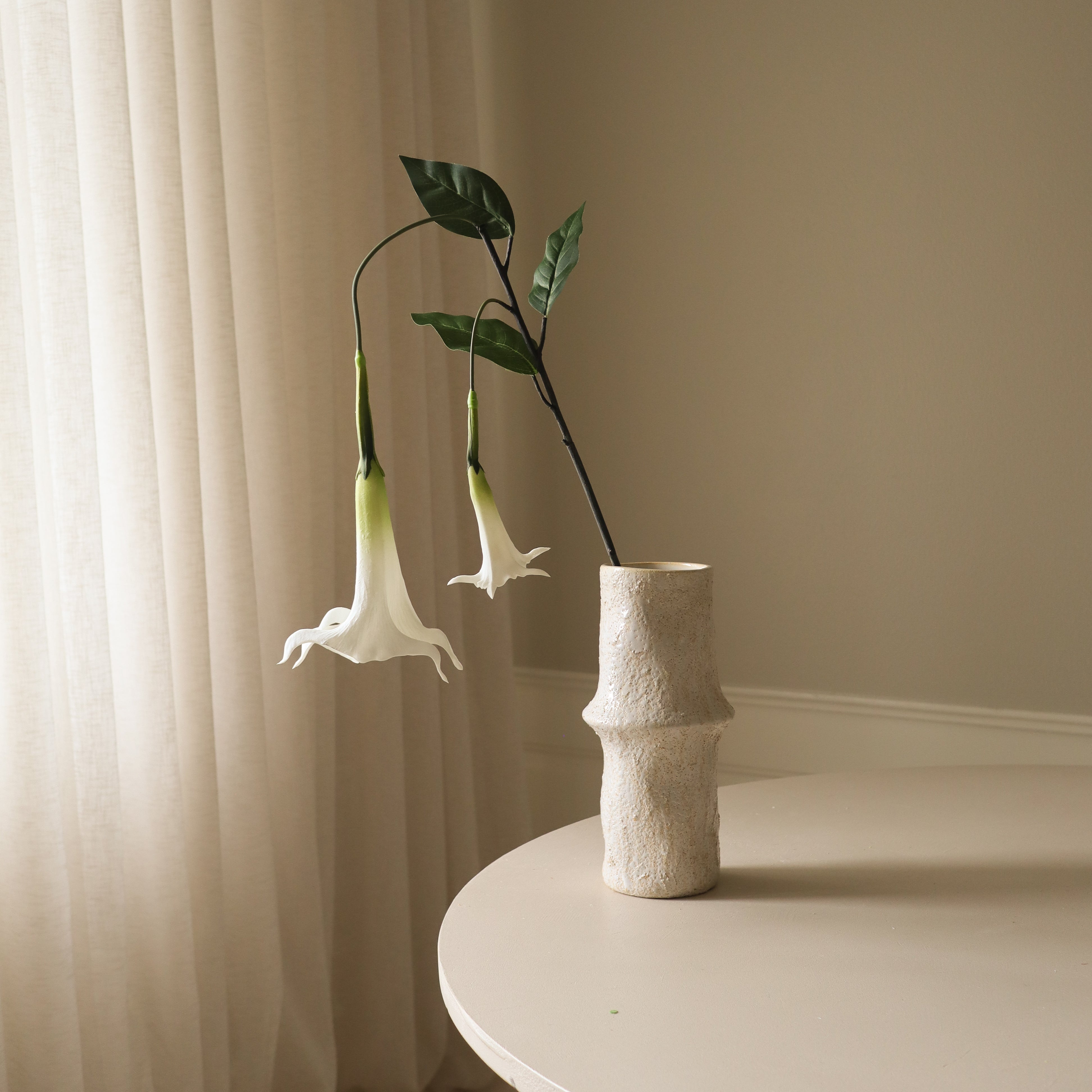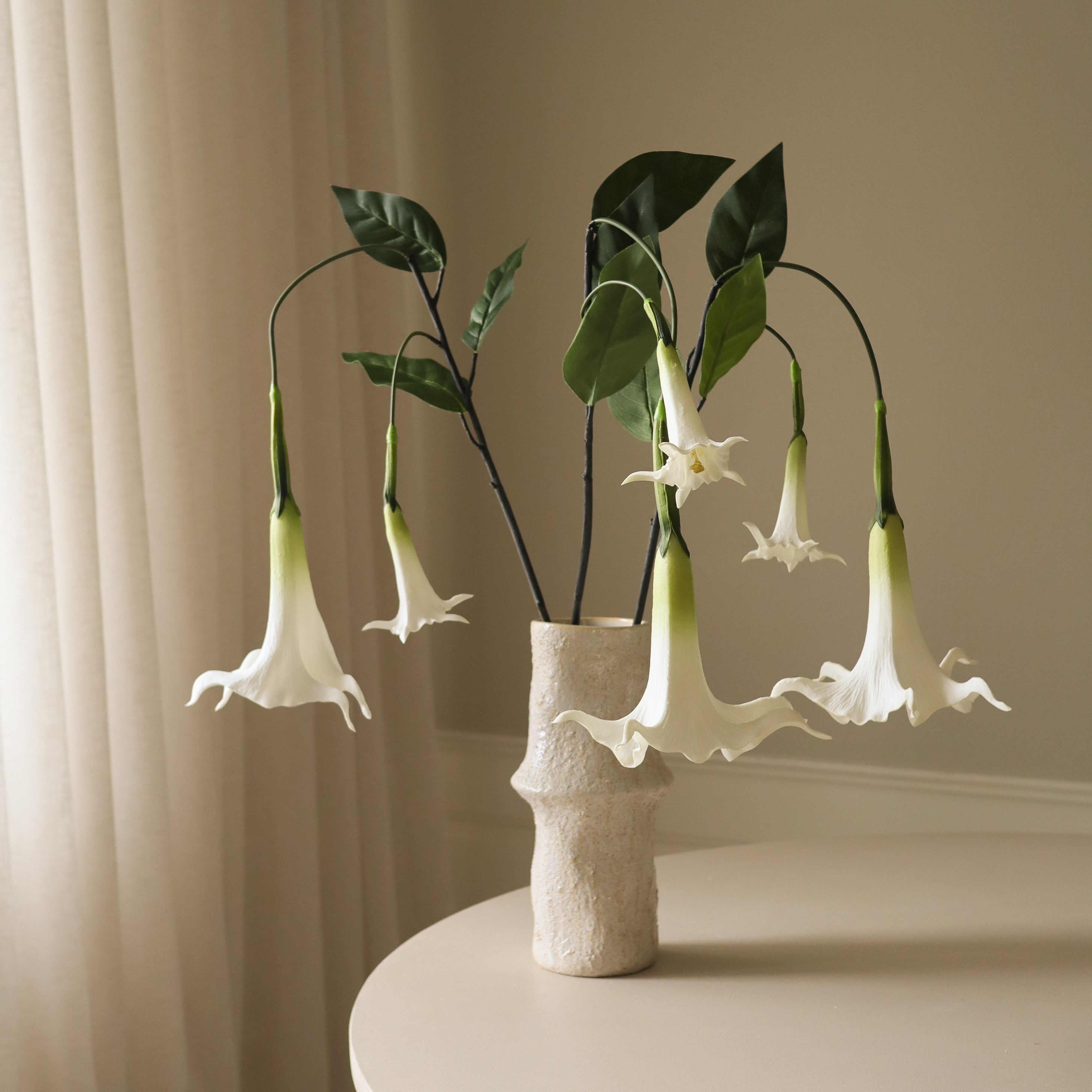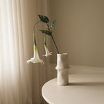 This White Large Datura Stramonium Flower showcases elongated, trumpet-shaped blooms that fade from pale green at the base to soft white at the edges, with gently curled petals adding texture. The slender, arching stem measures 84 cm in height and is adorned with deep green, slightly veined leaves that extend naturally along its length.