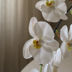 This White Large Orchid Flower has multiple pristine white blooms with a velvety texture and subtle translucency. The petals are smooth and slightly curved, with a golden yellow center accented by delicate hints of deep orange. The blossoms are arranged along a gracefully arching dark stem, accompanied by small curling tendrils. The stem is slender and sturdy, measuring 90 cm in height.