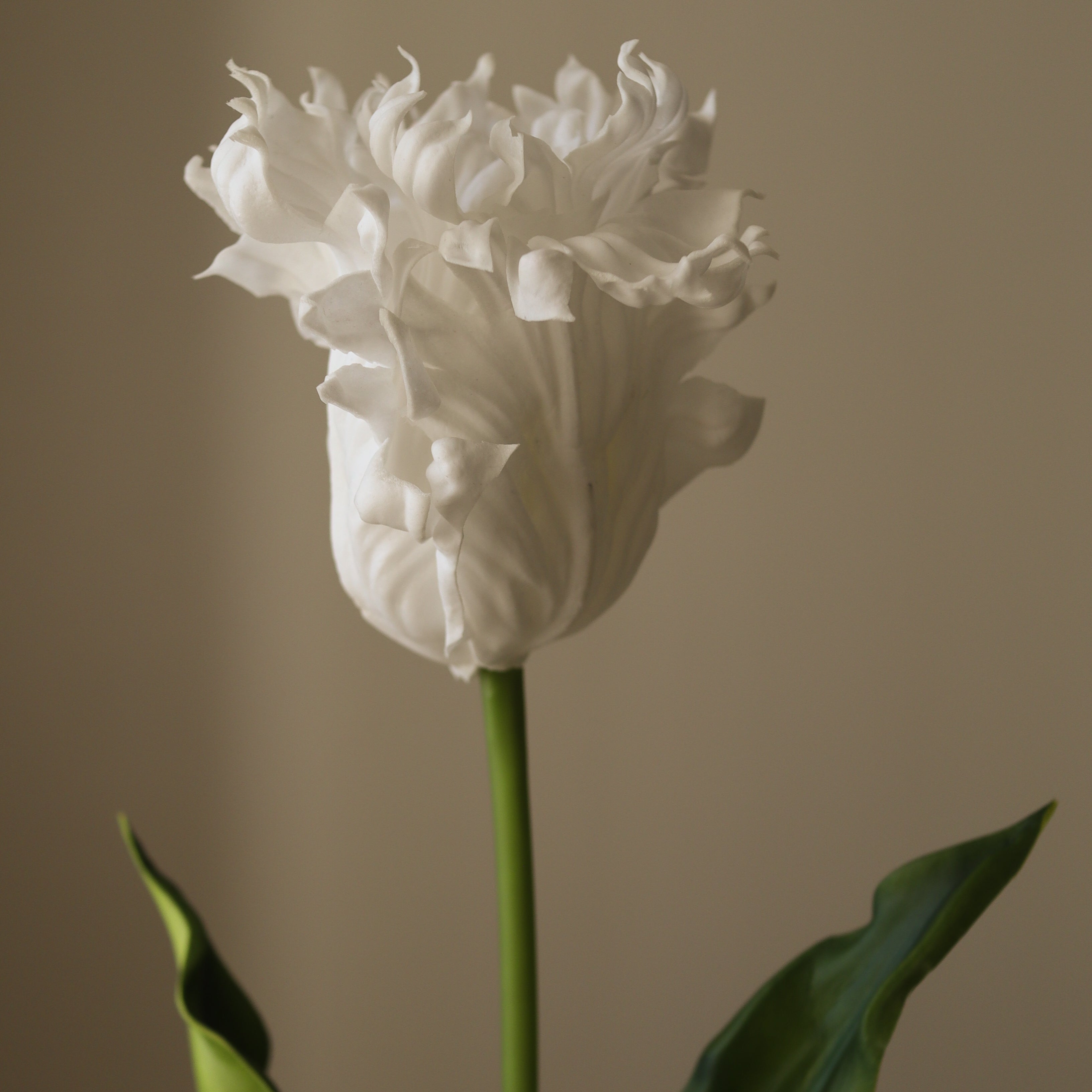 This White Large Parrot Tulip features a sculpted bloom with delicately ruffled petals in a crisp white shade. The intricate petal structure and subtle texture add dimension to the design. The stem measures 70 cm in height.