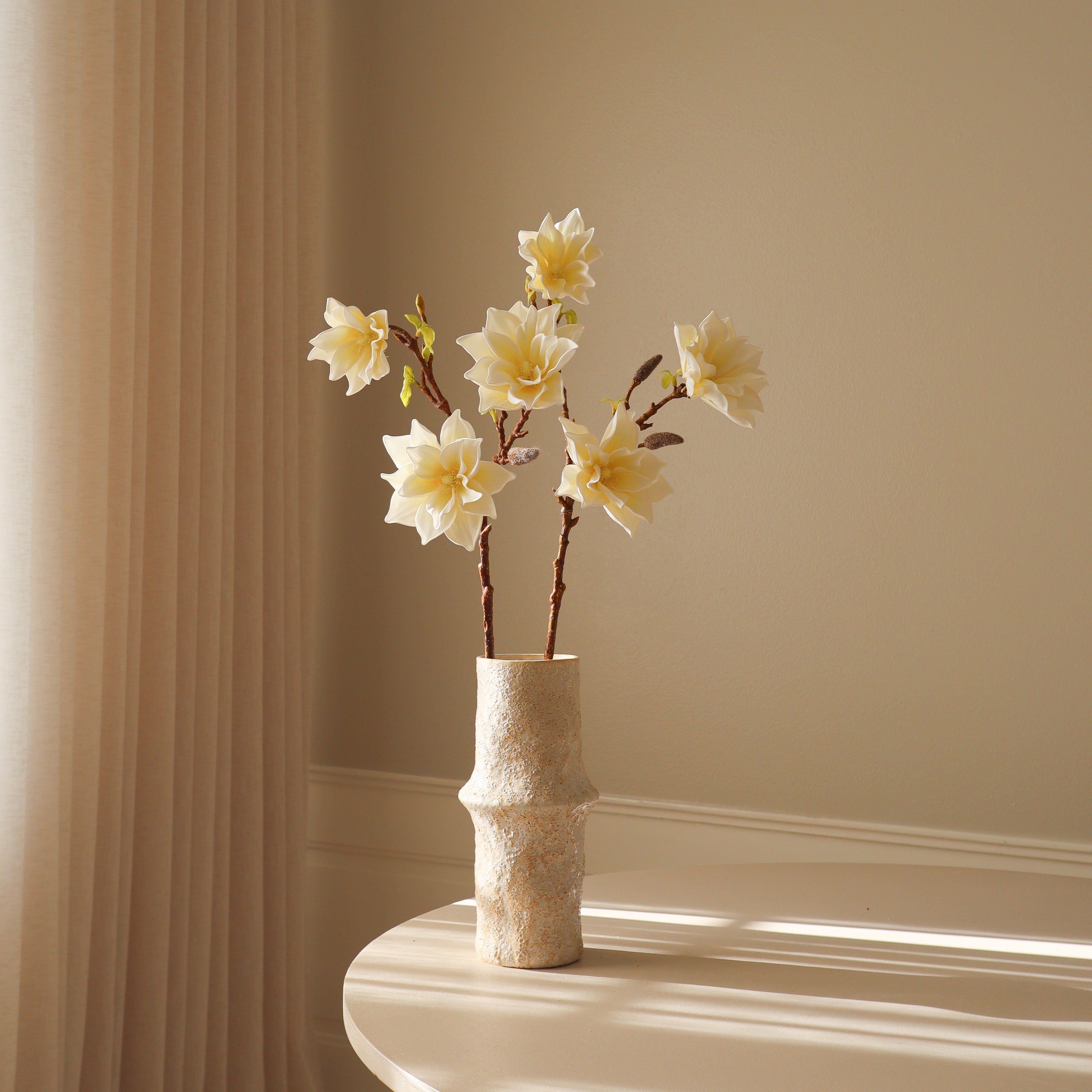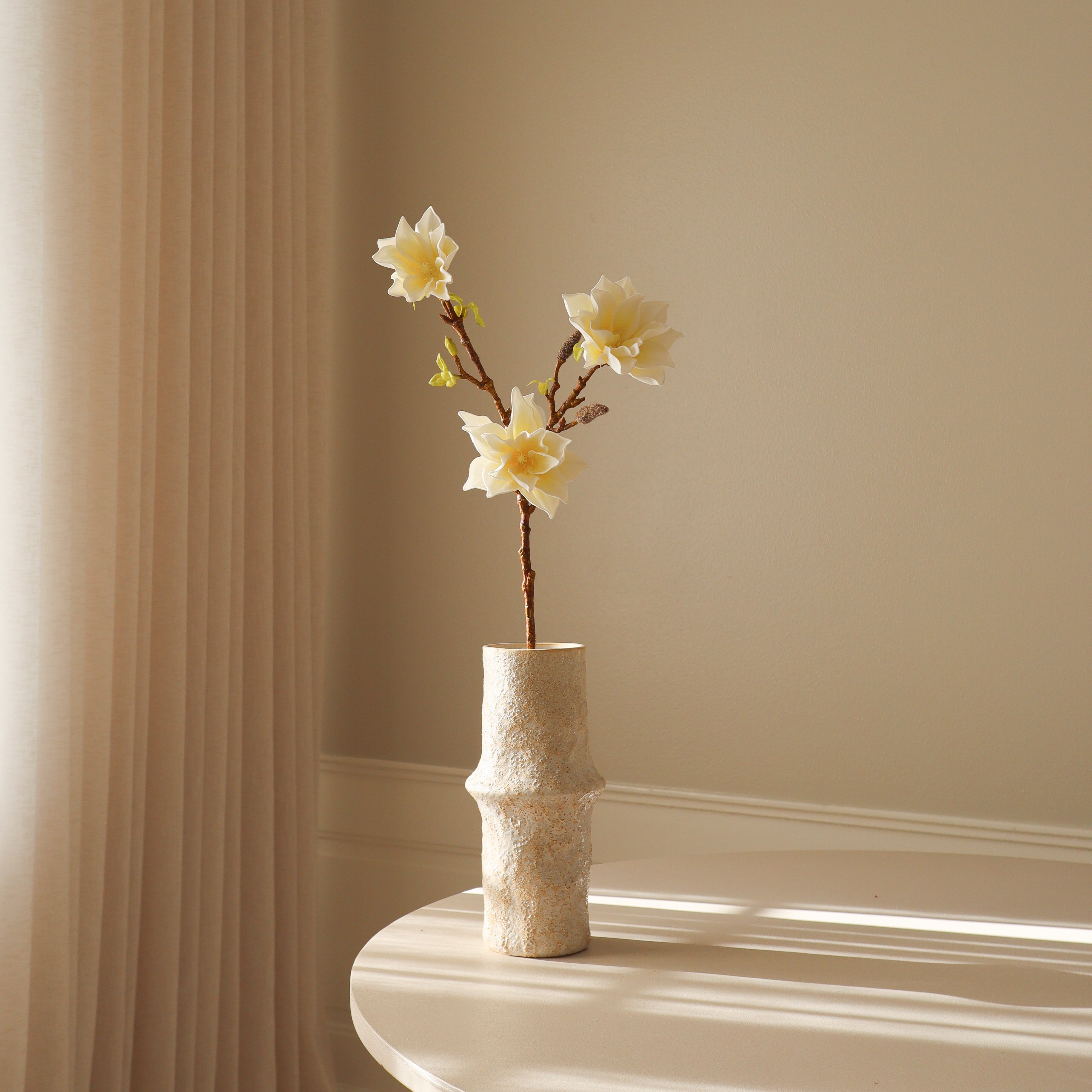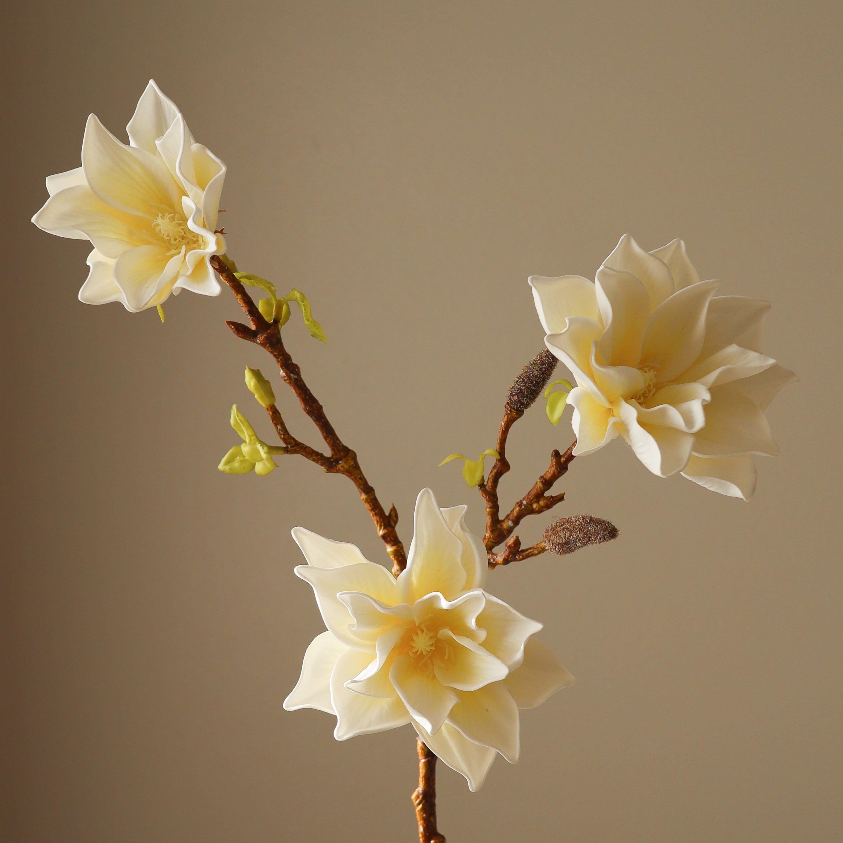 This White Lily Magnolia Branch features three large, delicately layered blossoms in soft ivory with subtle golden undertones. Each flower is accompanied by emerging buds and fine-textured catkins along a naturally textured brown branch. The blossoms sit on gracefully arching stems, which measure 76 cm in height, with small bright green leaves sprouting along the length.