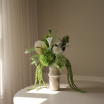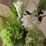 This bouquet showcases a fresh combination of crisp white and lush green tones, creating a structured yet flowing arrangement. The voluminous blooms contrast beautifully with delicate cascading accents, while elongated stems introduce height and movement. The varying textures add depth, blending soft, full petals with structured greenery for a natural and balanced composition.