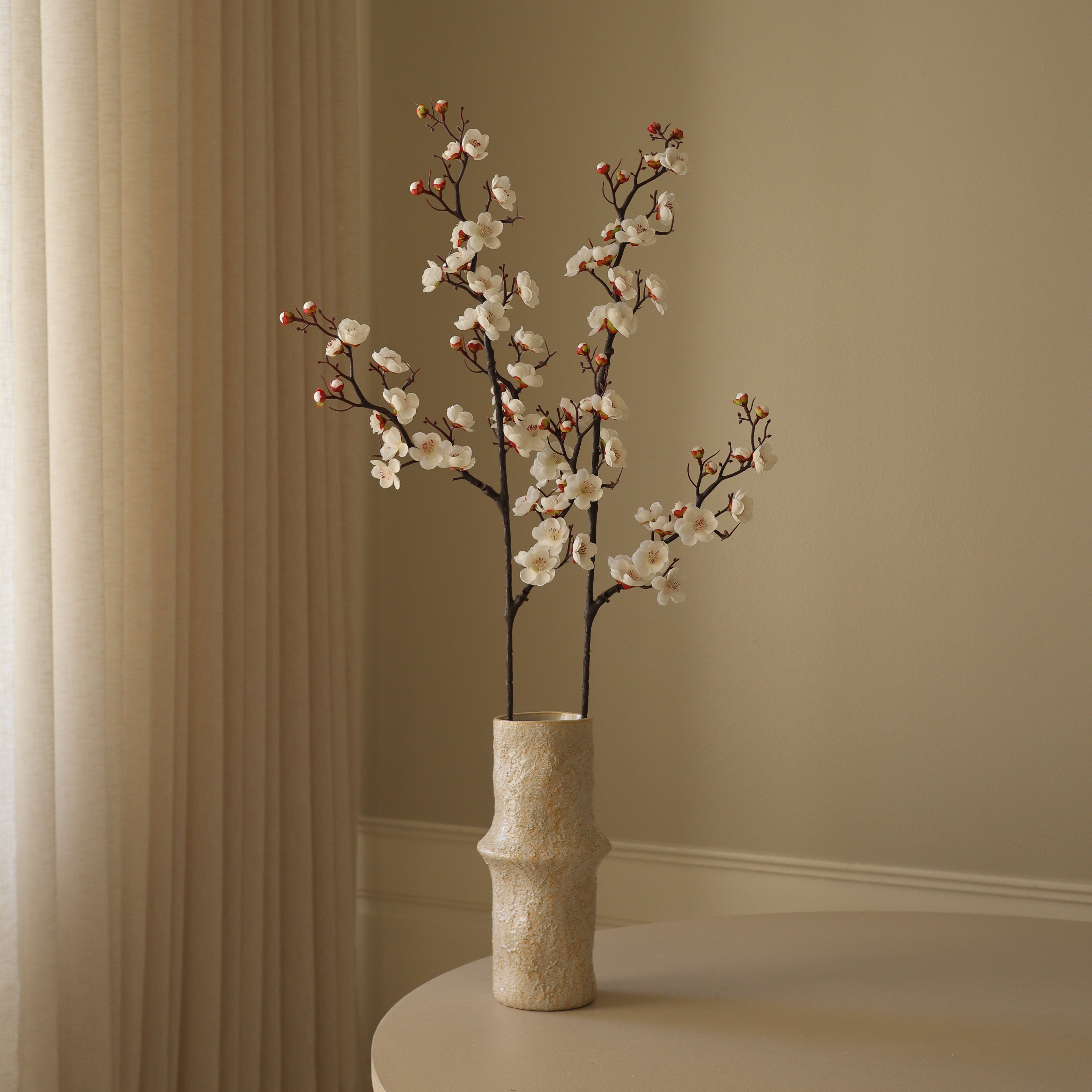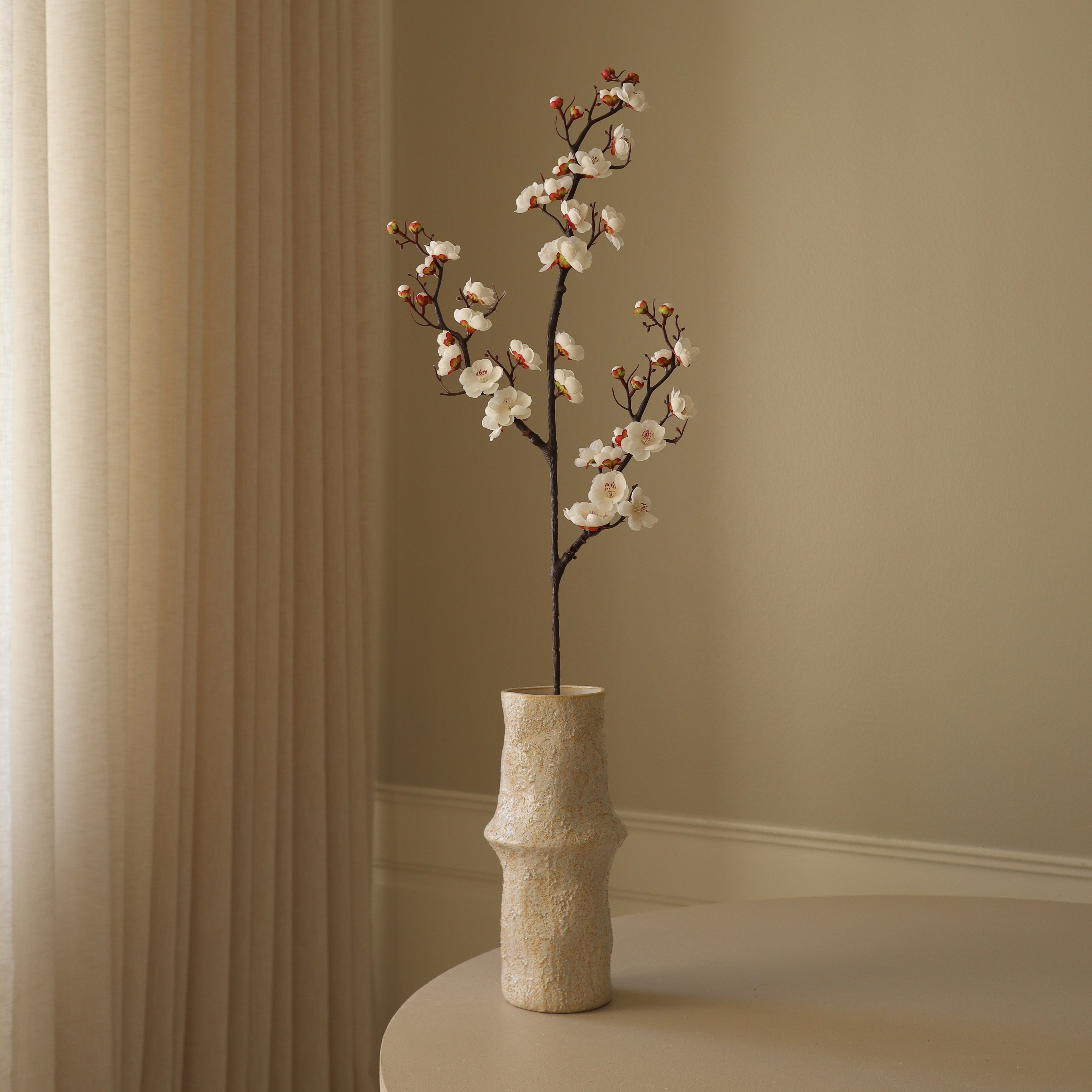 This White Plum Blossom Branch features delicate white petals with soft, rounded edges and deep red stamens, adding a subtle contrast to the blooms. The blossoms emerge from a dark, slender stem that extends gracefully to a height of 94 cm, showcasing clusters of buds and fully opened flowers.