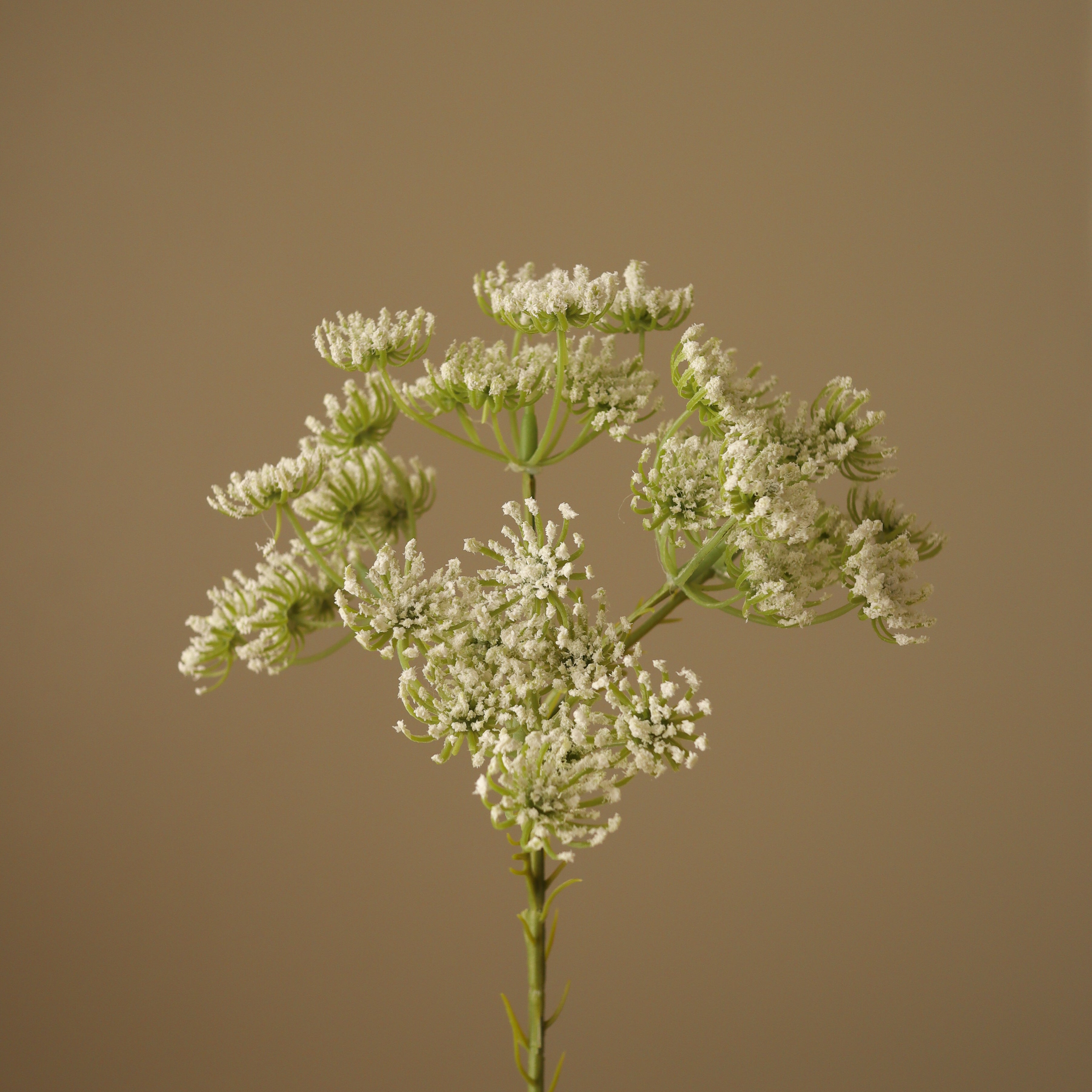 This White Queen Anne's Lace Flower features delicate clusters of tiny white blossoms forming intricate, lacy umbels. The blossoms are arranged on slender, slightly textured green stems, which measure 64 cm in height, with fine, feathery foliage accentuating their airy structure.