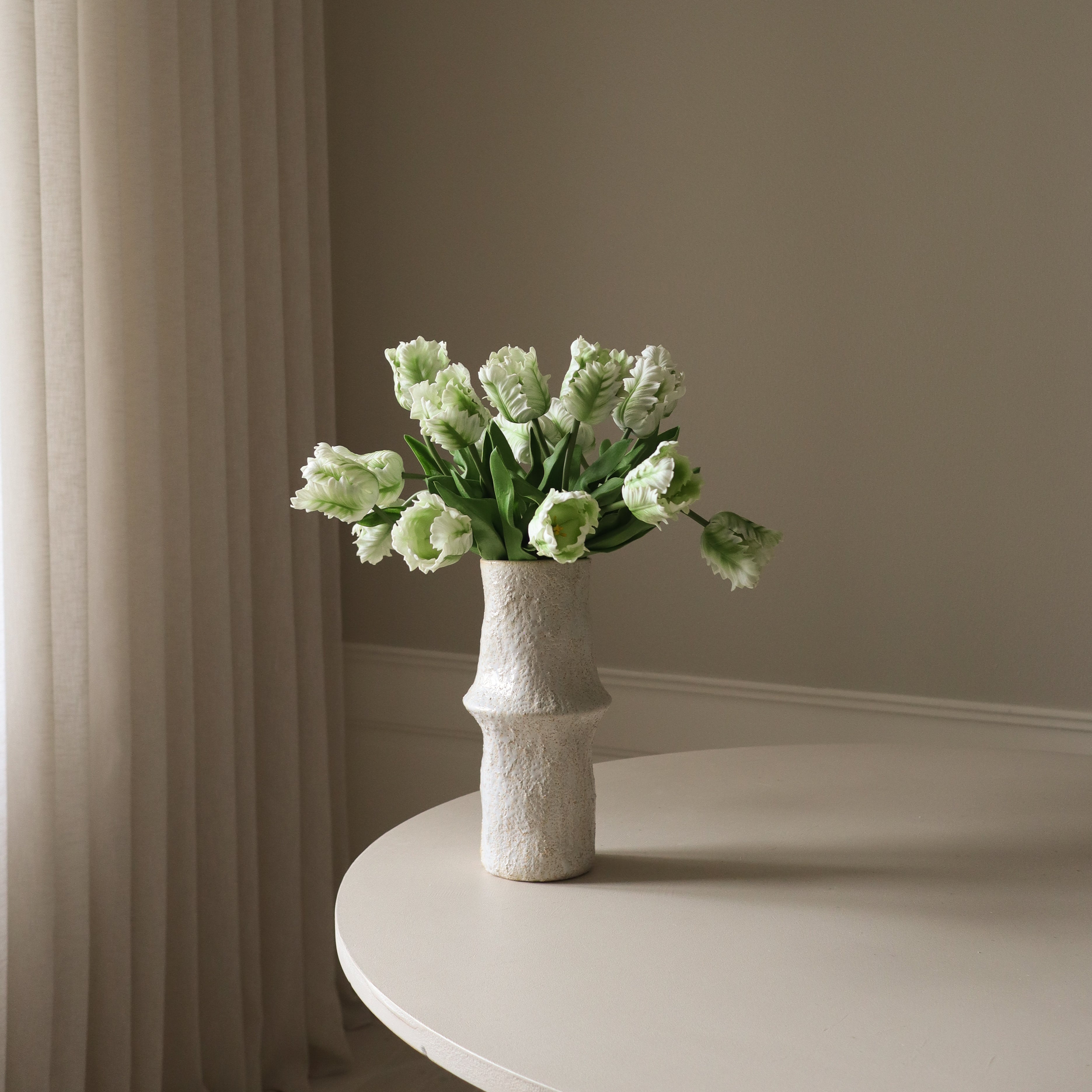 This bouquet showcases delicate parrot tulips in a soft white shade with subtle green accents. The gently ruffled petals and curved stems create an organic shape, complemented by lush green leaves.