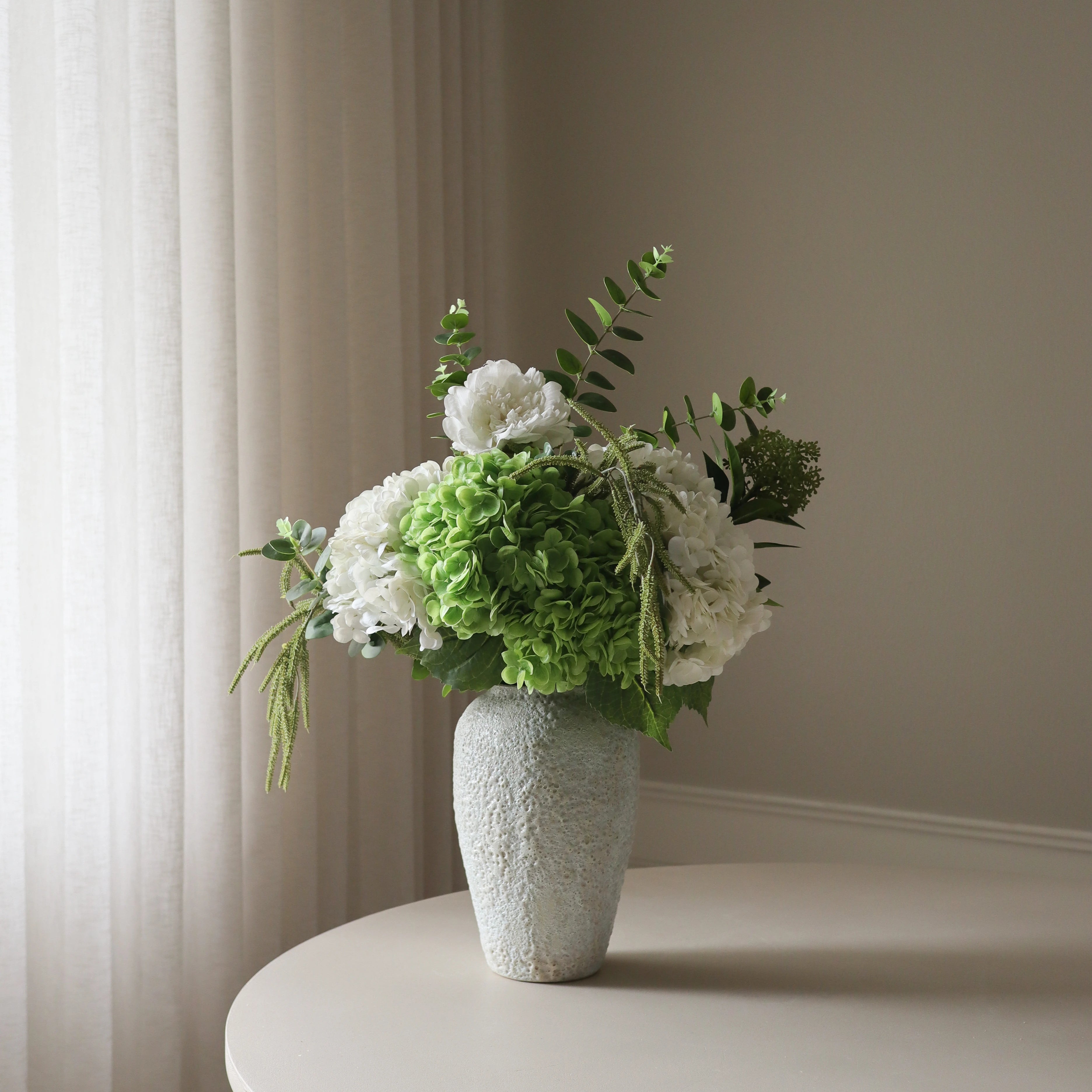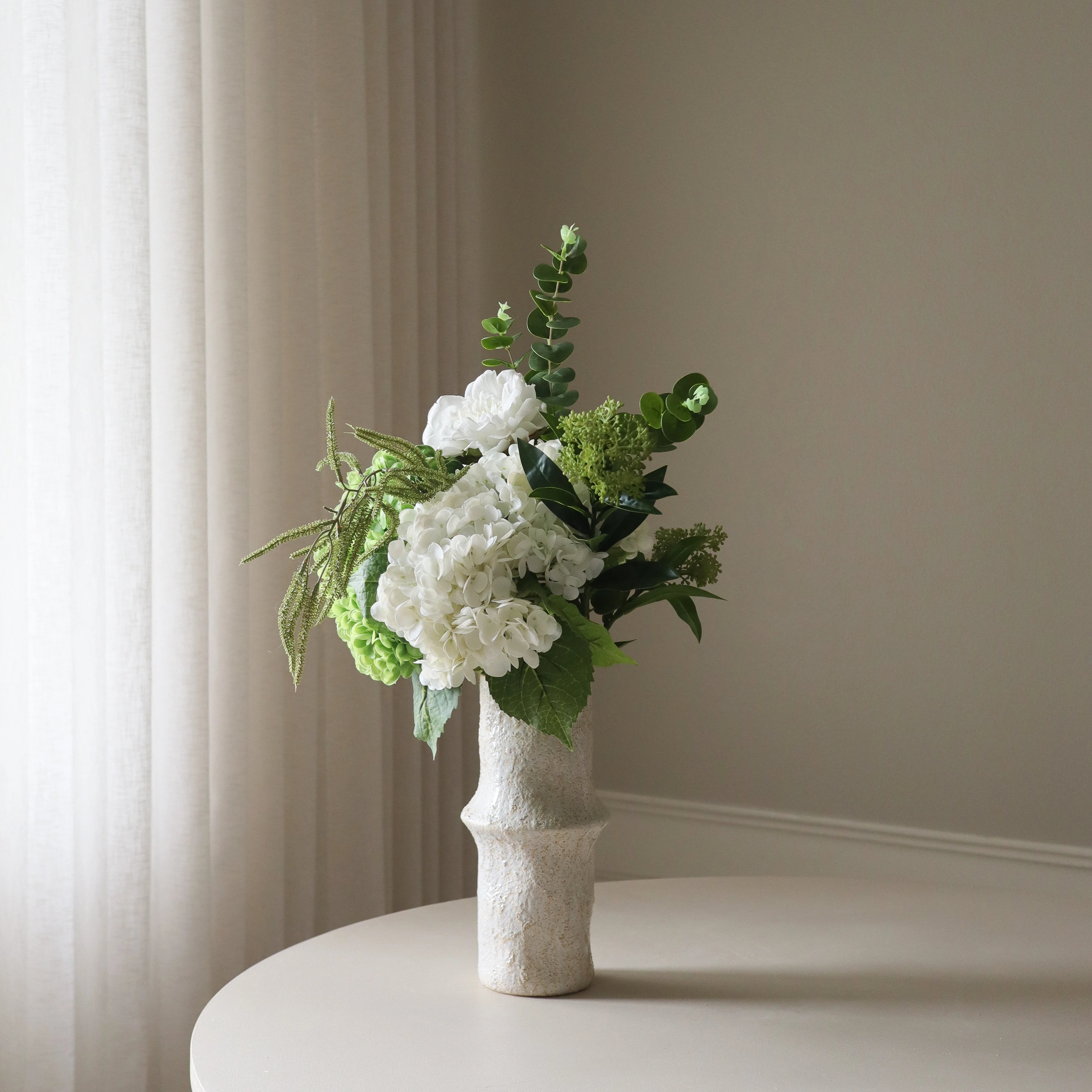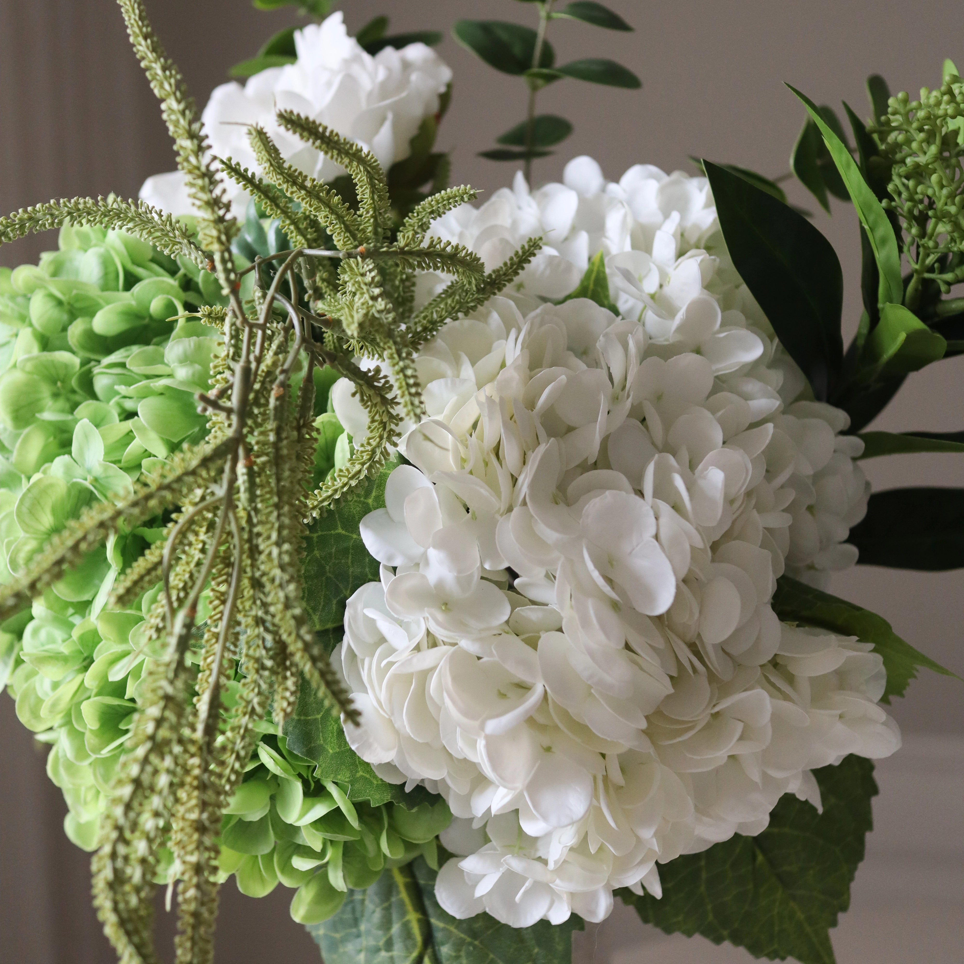 This bouquet features a lush combination of soft white and fresh green tones, creating a rich, organic arrangement with abundant texture. The voluminous blooms are balanced by flowing greenery and cascading elements, adding depth and movement to the composition.