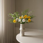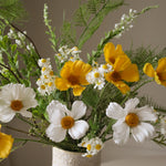 This bouquet features an airy arrangement of delicate white and yellow blooms, complemented by feathery fern leaves that add softness and movement. The cheerful daisies and wildflowers bring a fresh, spring-inspired look, making it a light and effortless composition.