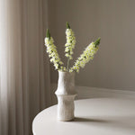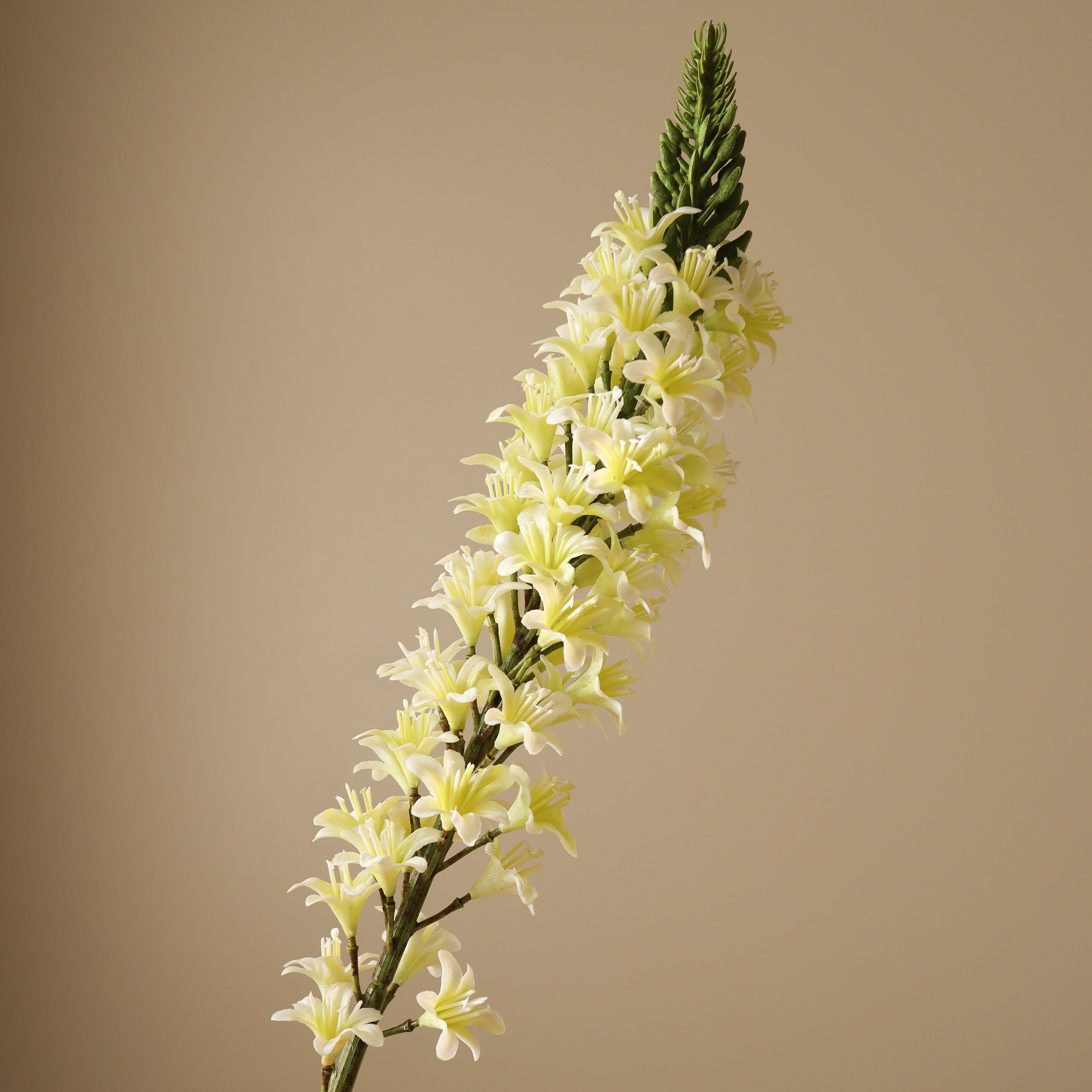 This White Eremurus Large Foxtail Lily features multiple delicate, star-shaped blossoms in pale yellow and white hues, arranged along a tall, tapering spike. The flowers have slightly curved petals with soft texture and are densely clustered, creating a structured and elongated form. The green, pointed bud at the top transitions into fully opened flowers along the stem. The slender green stem measures 68 cm in height.