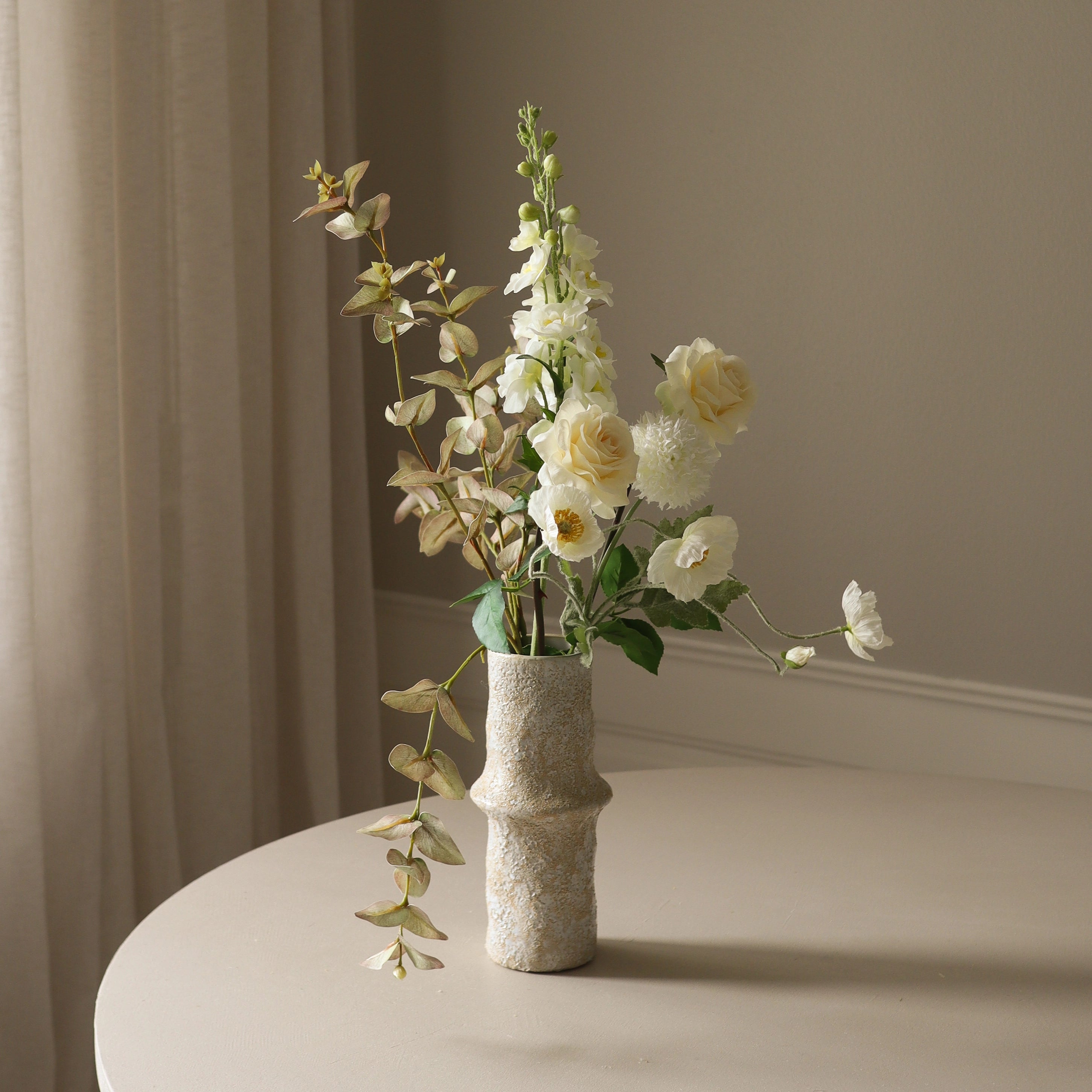 This arrangement blends soft cream and white hues with structured yet delicate textures, creating a refined and graceful composition. The lush, full blooms contrast beautifully with the tall, elegant stems, while the subtle variations in form and tone evoke a sense of timeless elegance. With its balanced mix of airy elements and sculptural shapes, this bouquet brings a serene and sophisticated presence to any space.