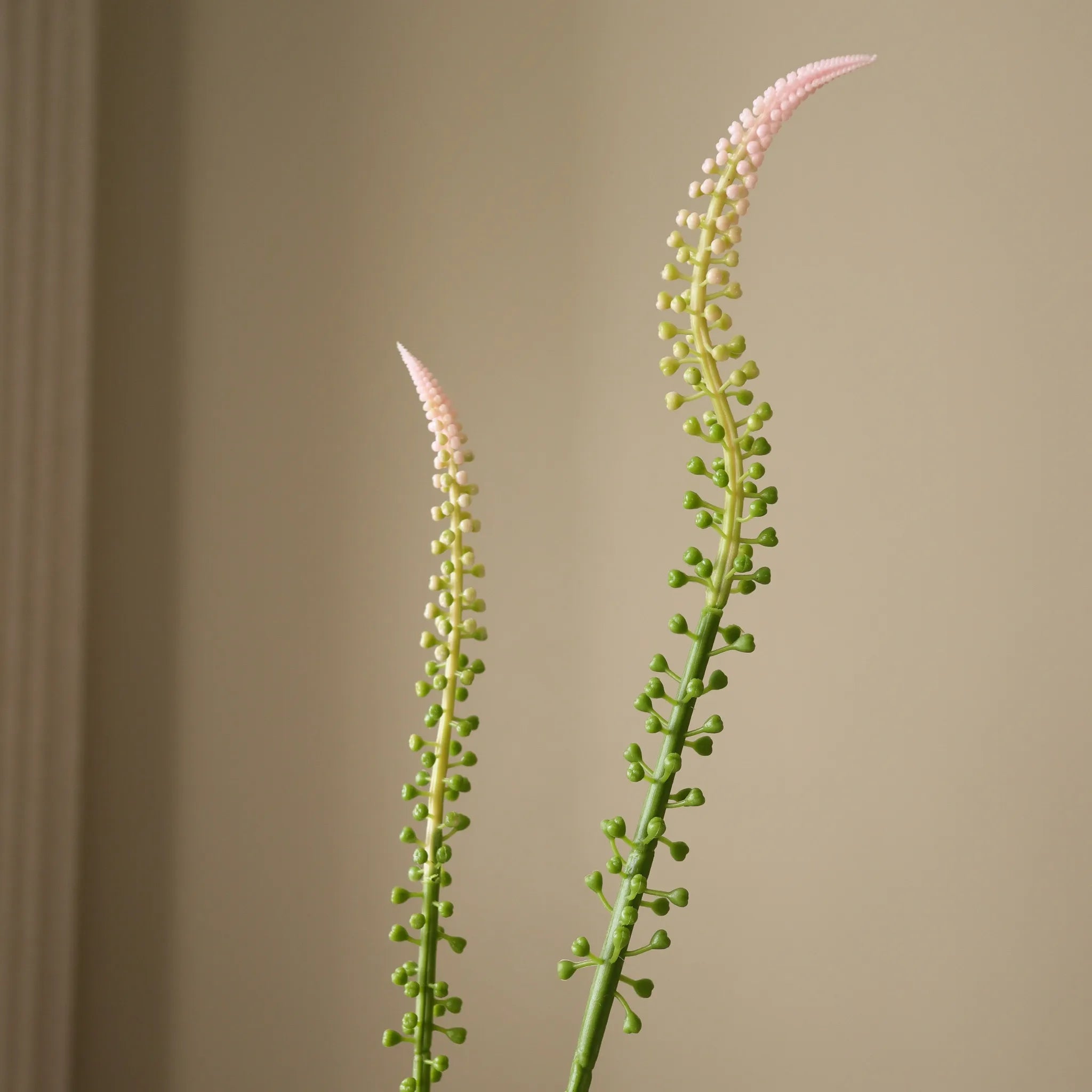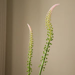 This Light Pink Actaea Racemosa "Fairy Candle" features two elongated flower spikes with a gradient of small, tightly clustered buds transitioning from green at the base to soft pink at the tips. The slender, slightly curved green stems extend upward, supporting the delicate floral structure. The stem measures 75 cm in height.