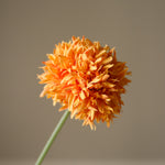 This Orange Allium Bulb stem features a single spherical flower head in a vibrant shade of orange, with numerous textured petals forming a dense, rounded shape. The slender green stem has a smooth, matte finish and reaches a height of 43 cm.