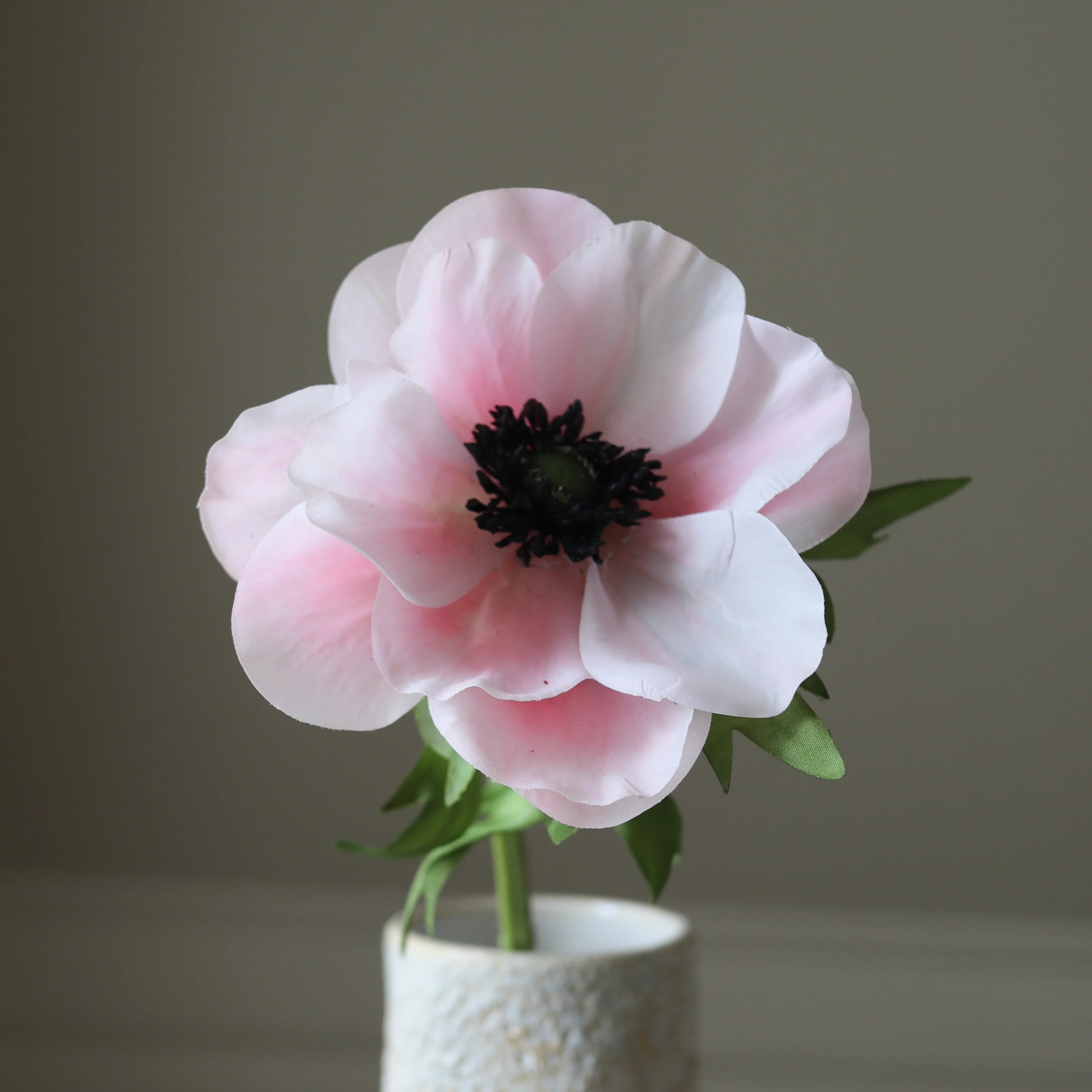 This Pink Anemone Flower features a single bloom with soft, silky petals in light pink hues, accented by a dark black center. The petals have subtle variations in color, giving depth and texture, while the jagged green leaves extend from the stem. The slender, green stem reaches a height of 43 cm.