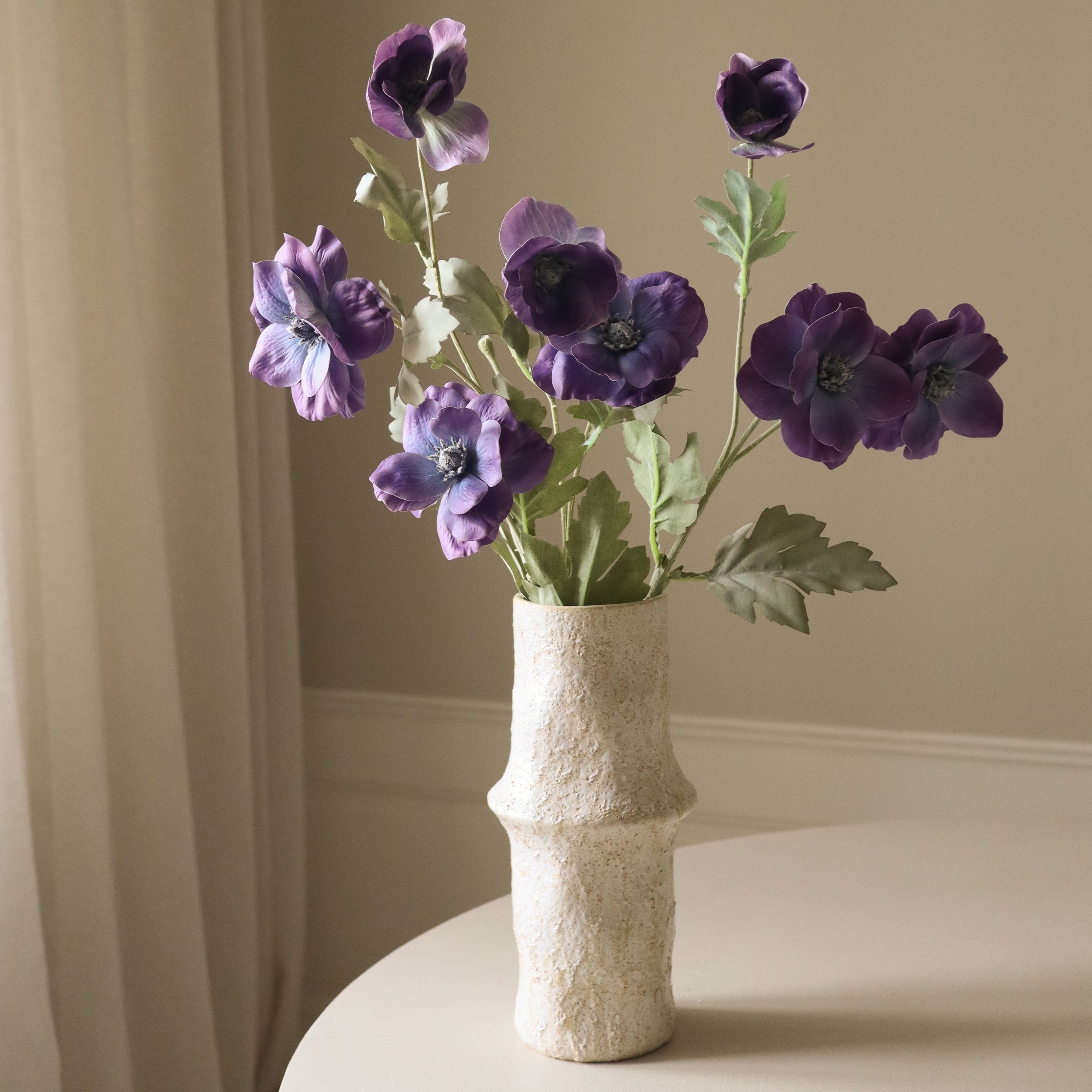 This Purple Anemone Flower stem features multiple delicate blooms with smooth, rounded petals in soft purple tones, transitioning from a rich violet to a muted lavender hue. The petals surround a dark, textured center and are complemented by slender green stems and softly veined, dusty green leaves. The height of the stem is 70 cm.