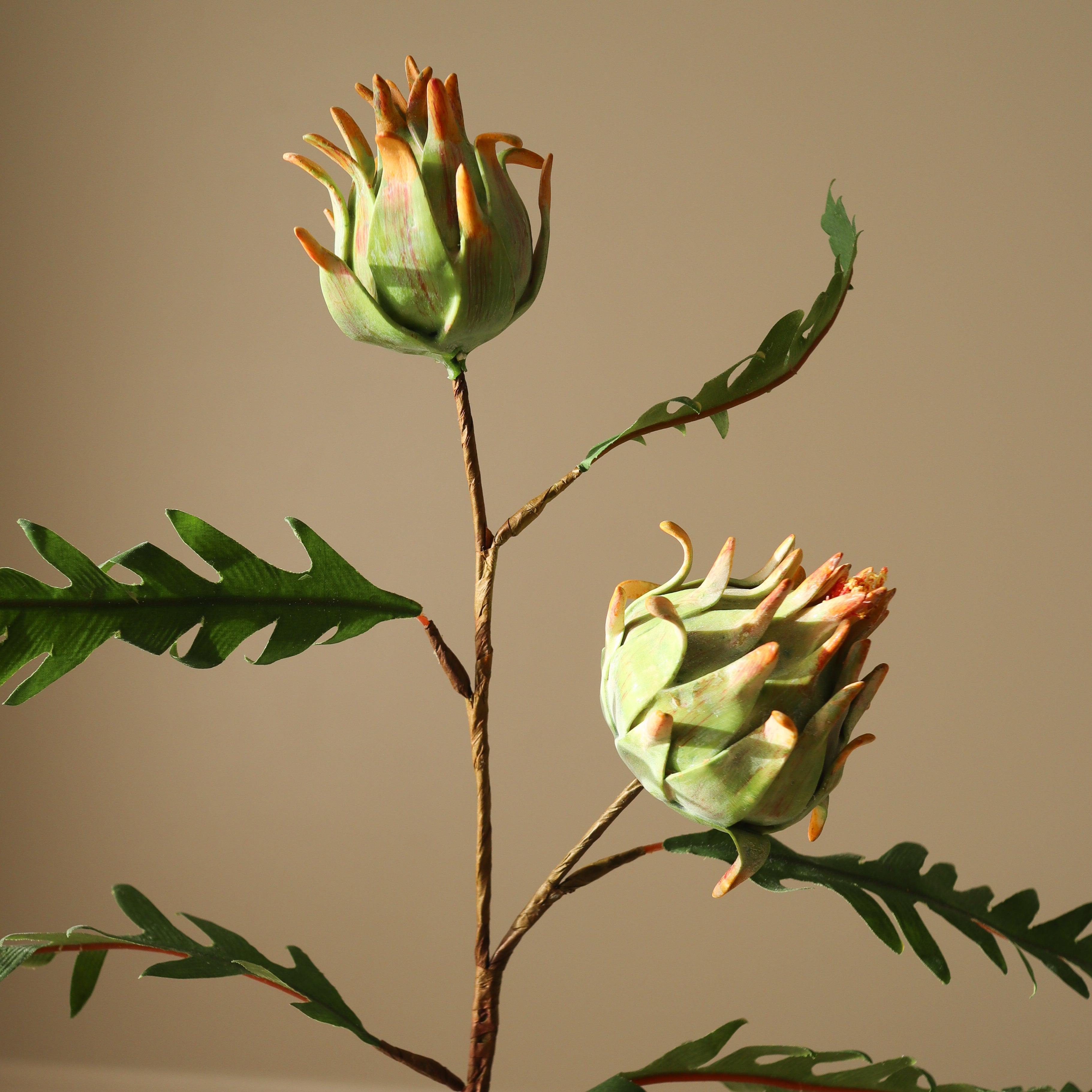 This Green Artichoke Branch features two rounded buds with layered green bracts tipped in muted orange, creating a structured, sculptural form. The buds are set along a twisting, textured stem that supports elongated, deeply lobed green leaves with a slightly serrated edge. The branch reaches a height of 58 cm.