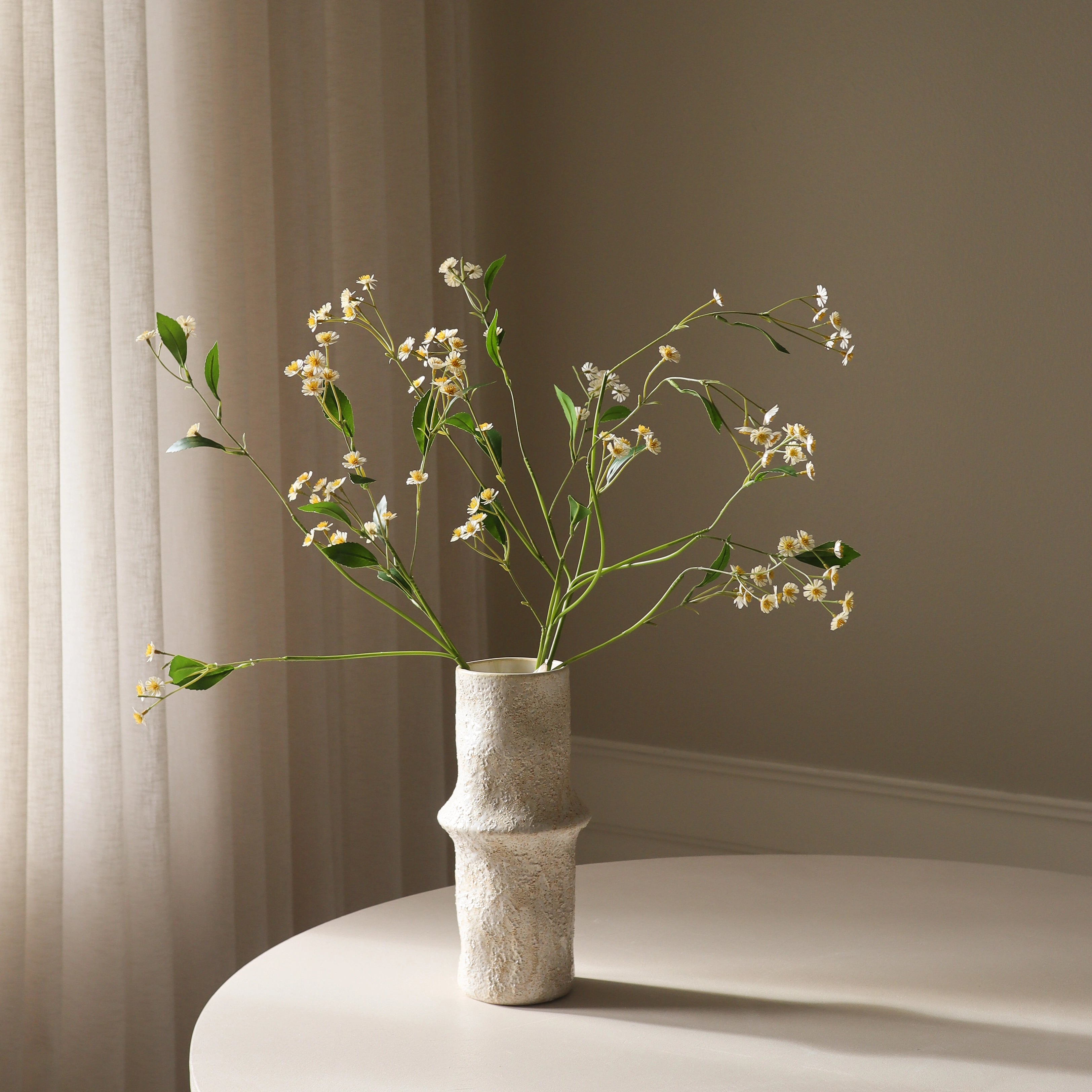 This White Chamomile Daisy Flower has multiple small, open blooms with bright white petals and soft yellow centers. The blooms are arranged along slender green stems with a soft texture and scattered, smooth green leaves. The stems reach a height of 86 cm, giving the arrangement a natural, airy appearance.
