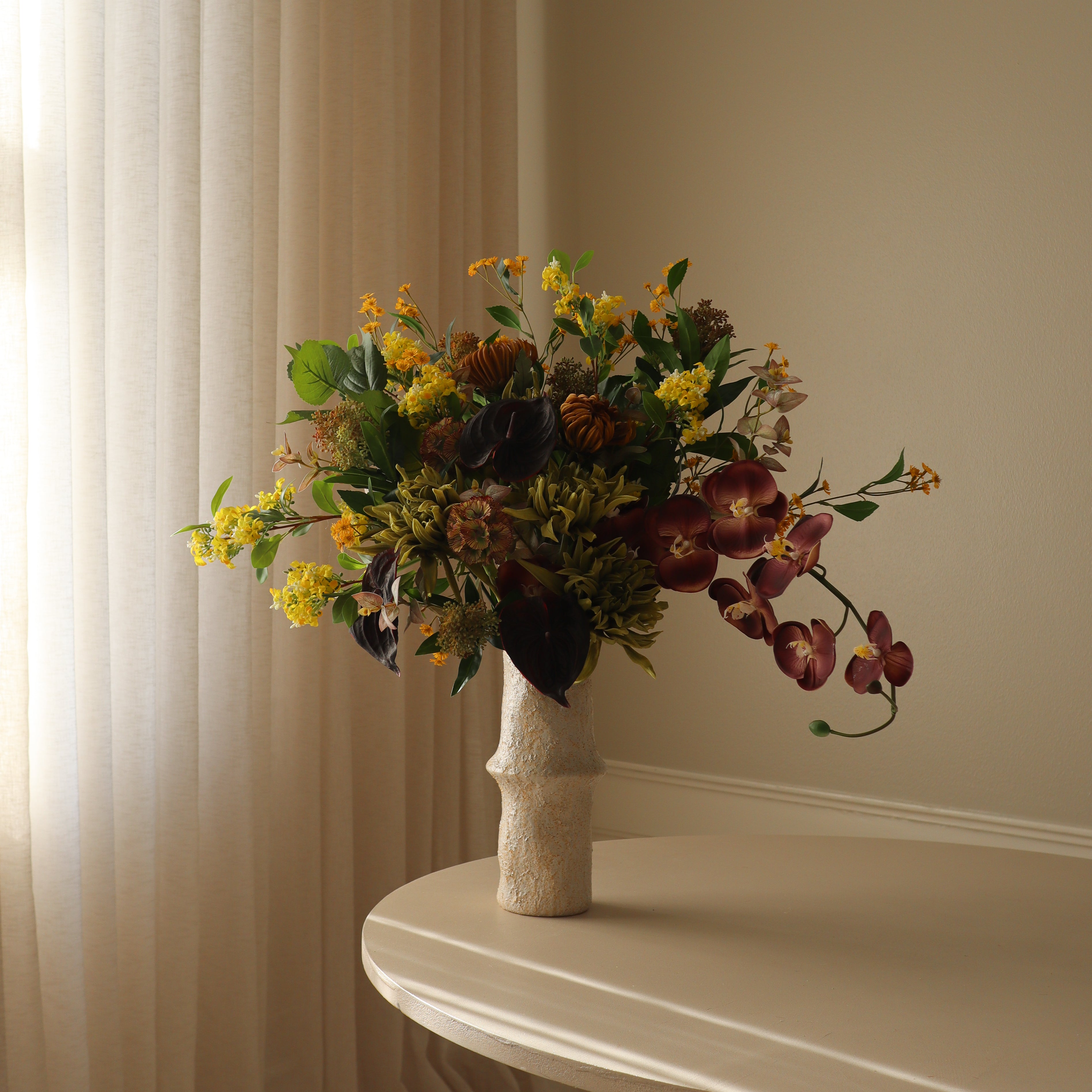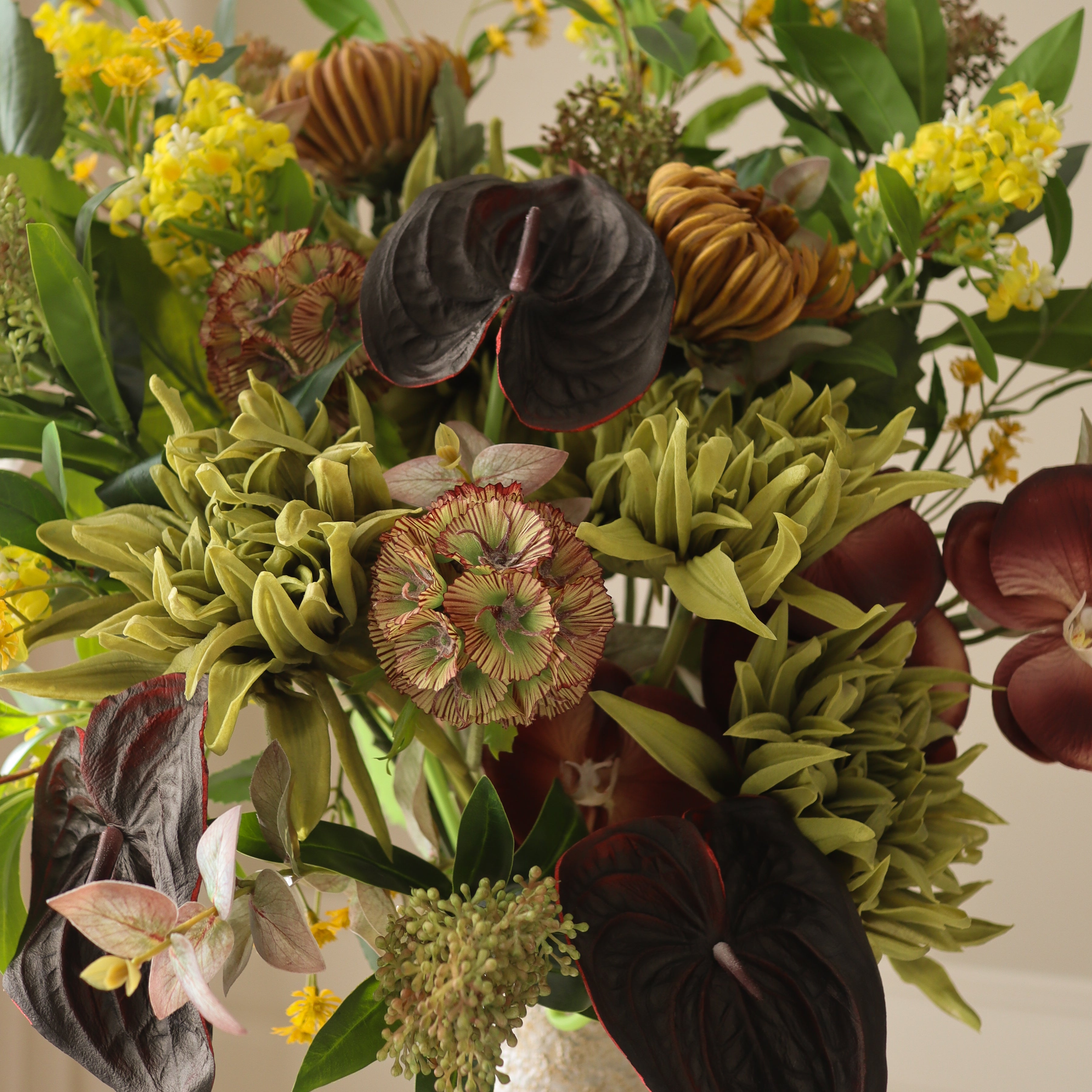 This bouquet showcases a blend of deep tones and earthy textures, creating a dynamic arrangement with rich contrast. The combination of structured and delicate blooms adds depth, while cascading elements provide movement.