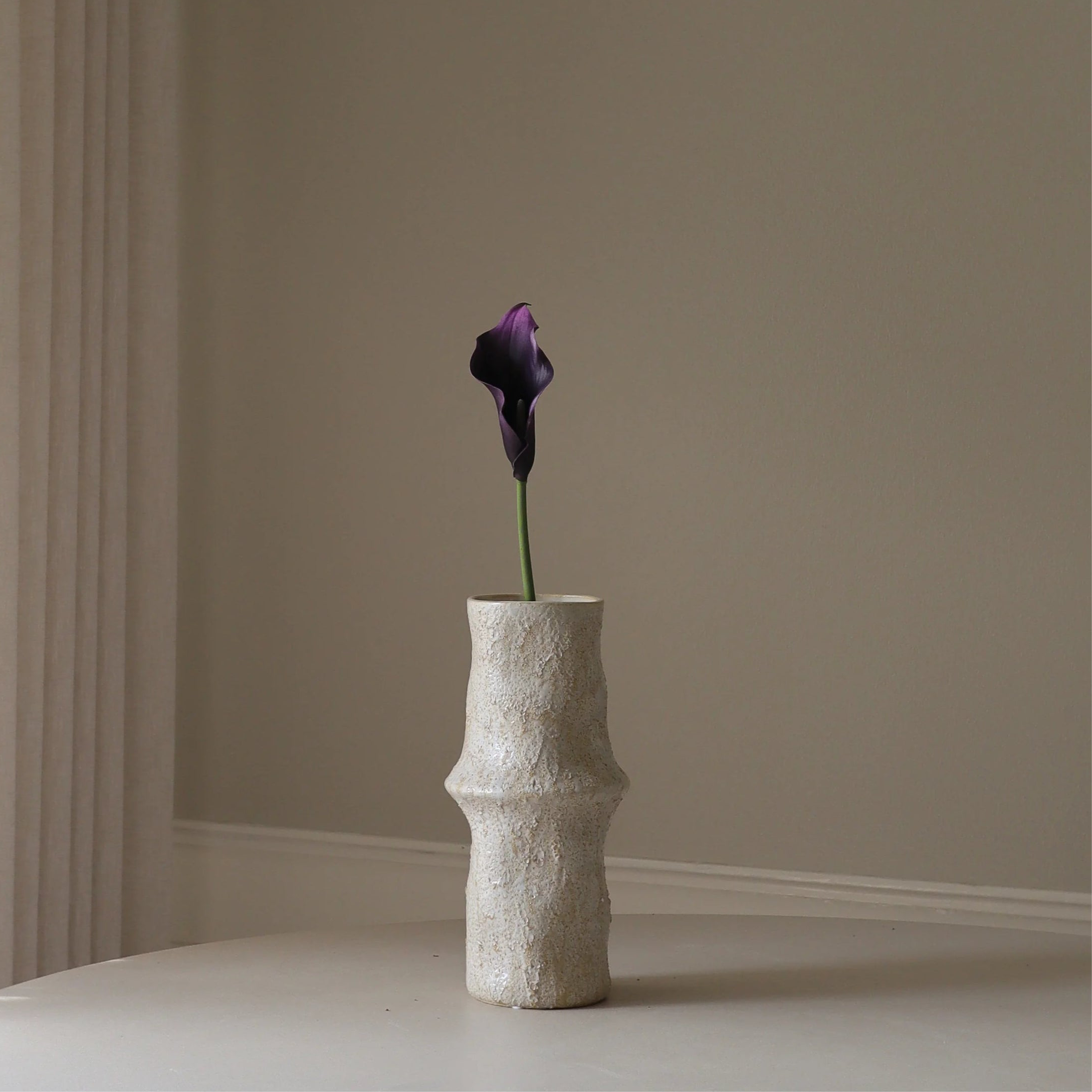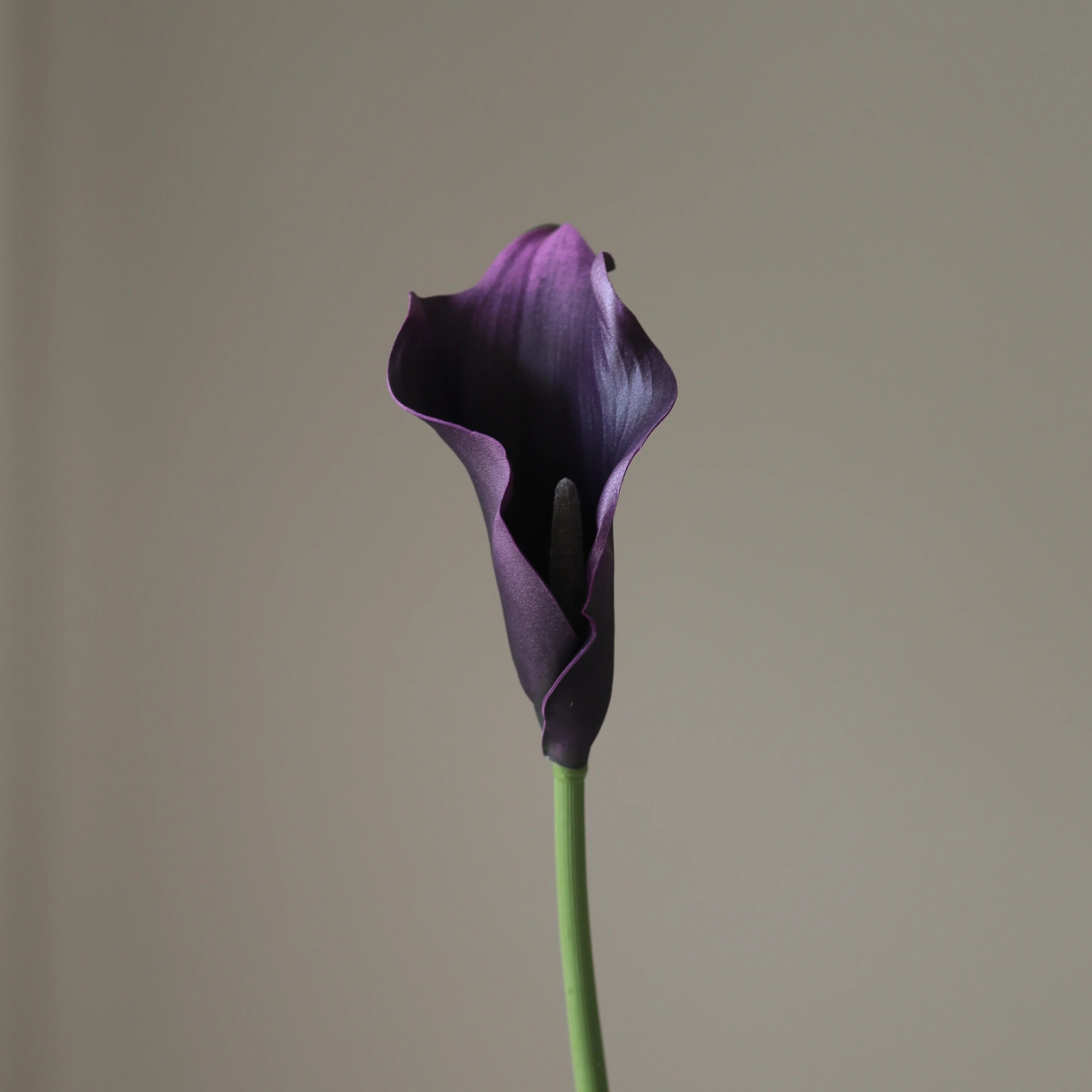 A sleek single stem featuring a sculptural calla lily bloom in a deep, velvety purple hue. The flower showcases one gracefully curved head atop one slender stem with a smooth, real-touch surface and a subtle sheen. The flower is supported by a natural-looking stem and measures approximately 50 cm in height.