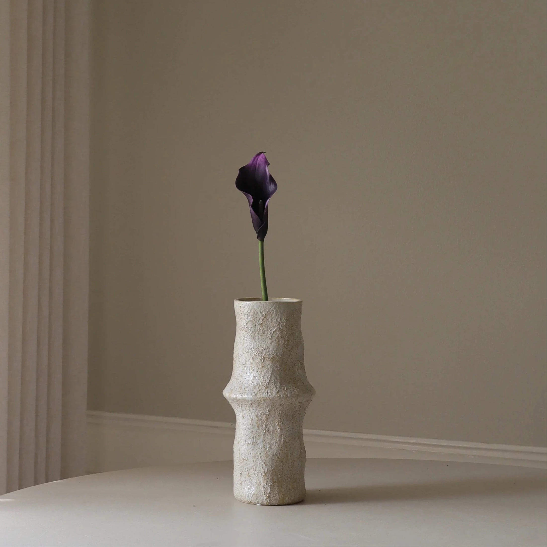 The Small Ceramic Earth Vase featured in the image measures 24.5 cm in height and 8 cm in diameter.