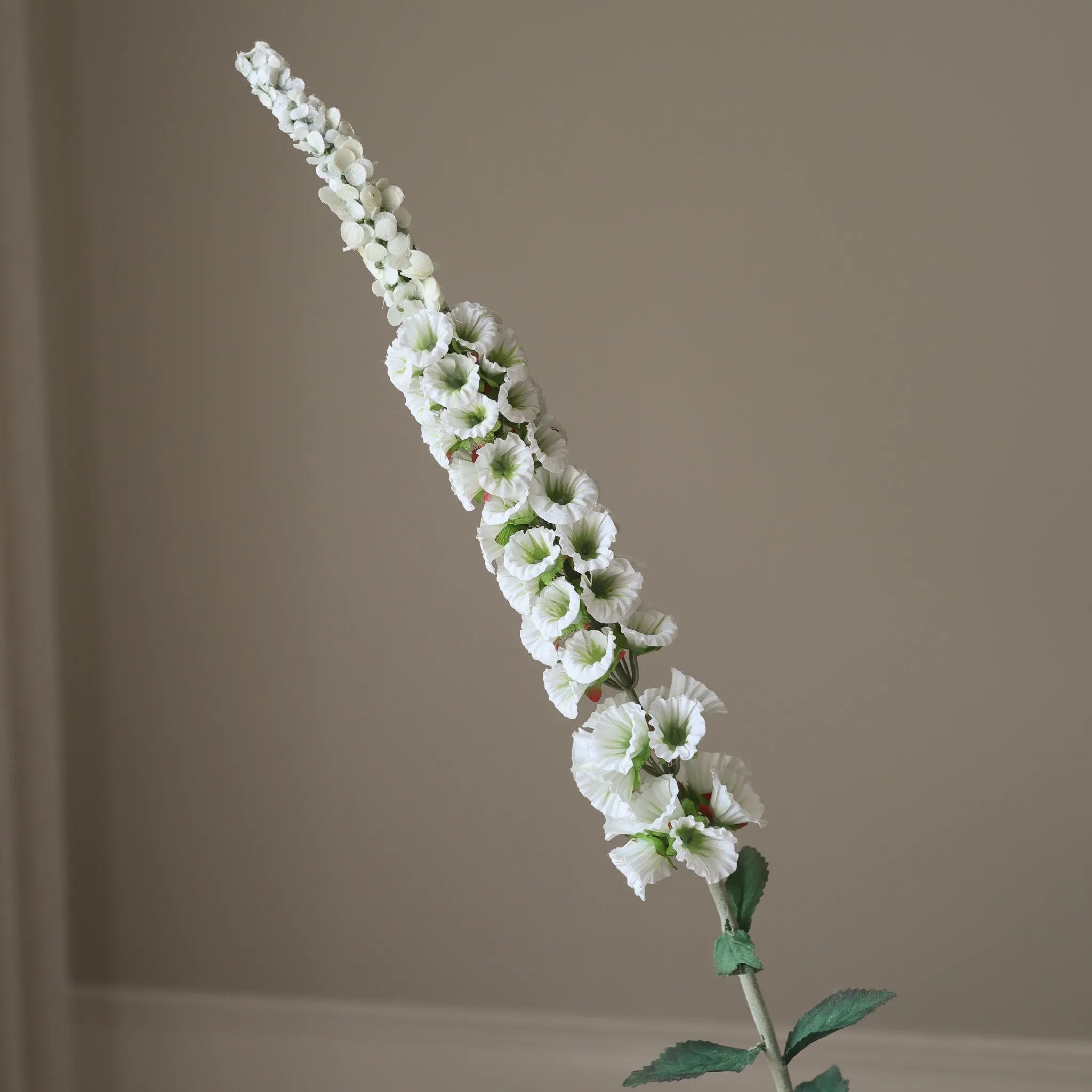 This White Foxtail Flower features a tall, tapering floral spike densely adorned with delicate, ruffled white blossoms. The blossoms form a soft, textured surface along the slender, elongated inflorescence, creating a striking vertical element. The structured green stem, measuring 76 cm in height, provides balance to the airy floral arrangement.