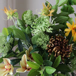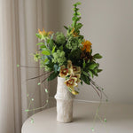 This bouquet features a rich mix of golden yellow, soft ivory, and deep green tones, anchored by sculptural blooms and glossy foliage. Rounded flower heads are balanced with spiky accents and gently extending stems, creating a composed yet dynamic arrangement.