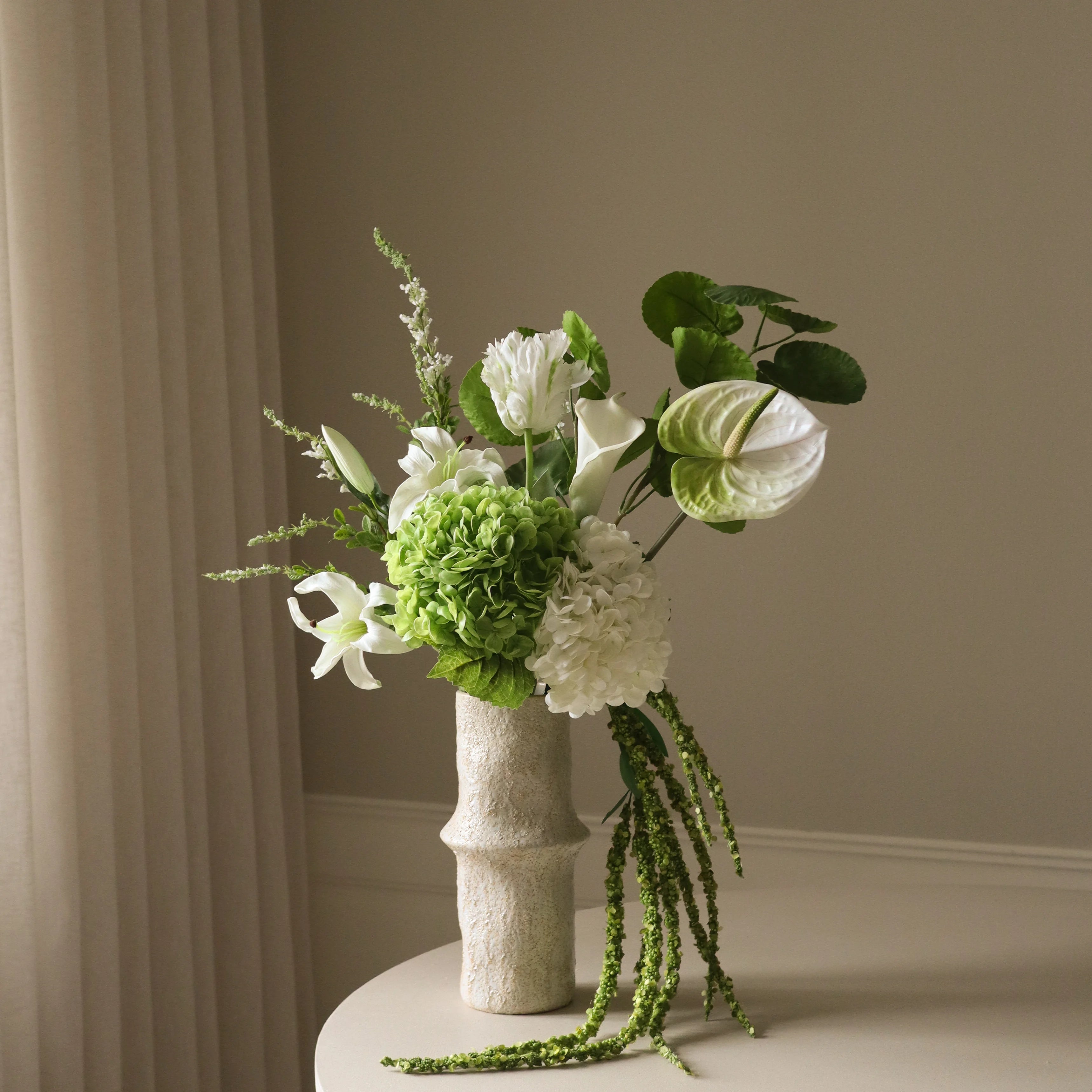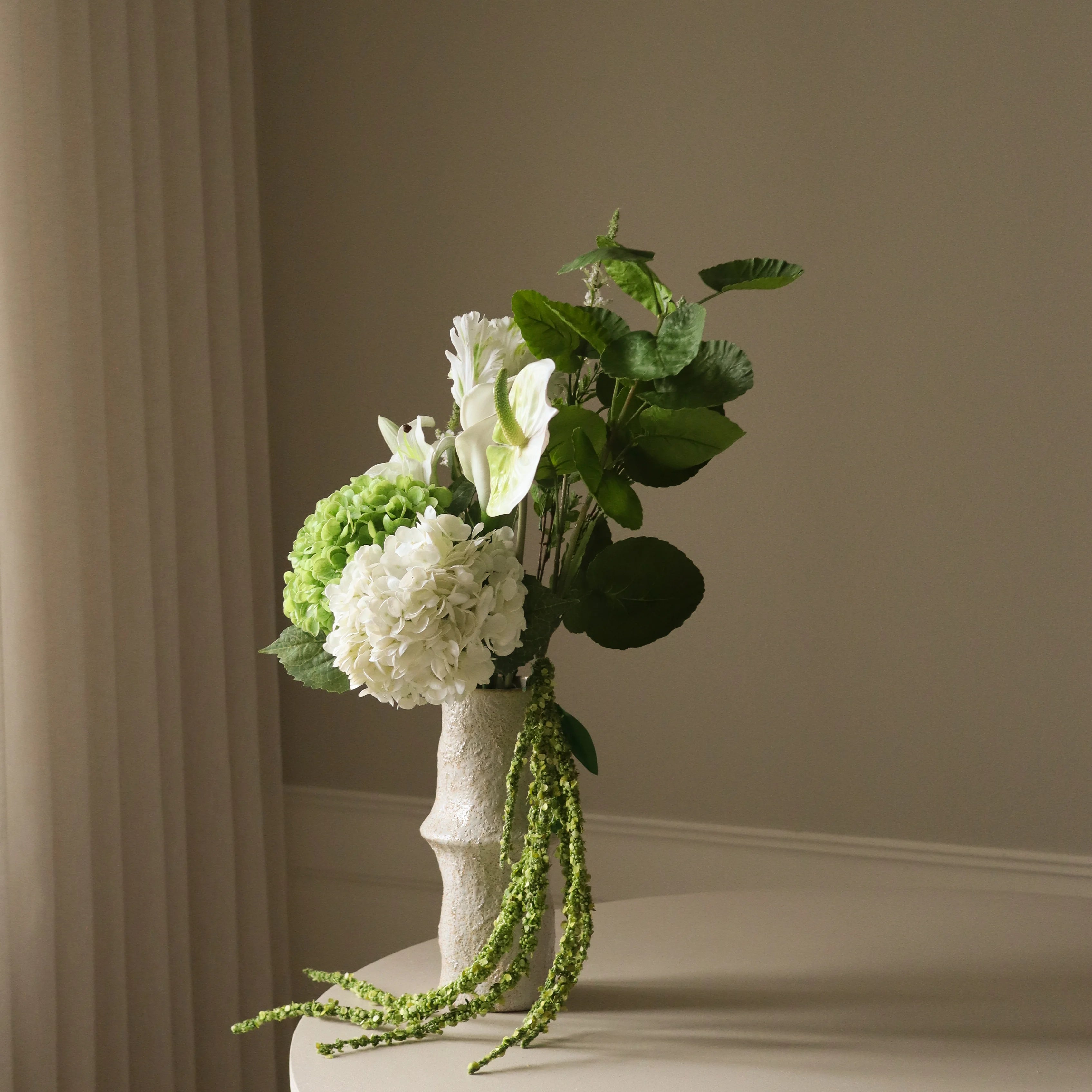 This bouquet highlights a fresh combination of green and white tones, blending lush textures with structured floral elements. The voluminous hydrangeas provide a rich foundation, while delicate petals and elongated stems add balance and elegance.