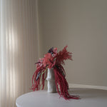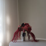 This bouquet is a bold composition of deep red and dark hues, featuring sculptural elements and cascading textures that create a striking visual impact. The contrast between glossy and feathery elements adds depth and movement, making it an eye-catching arrangement.