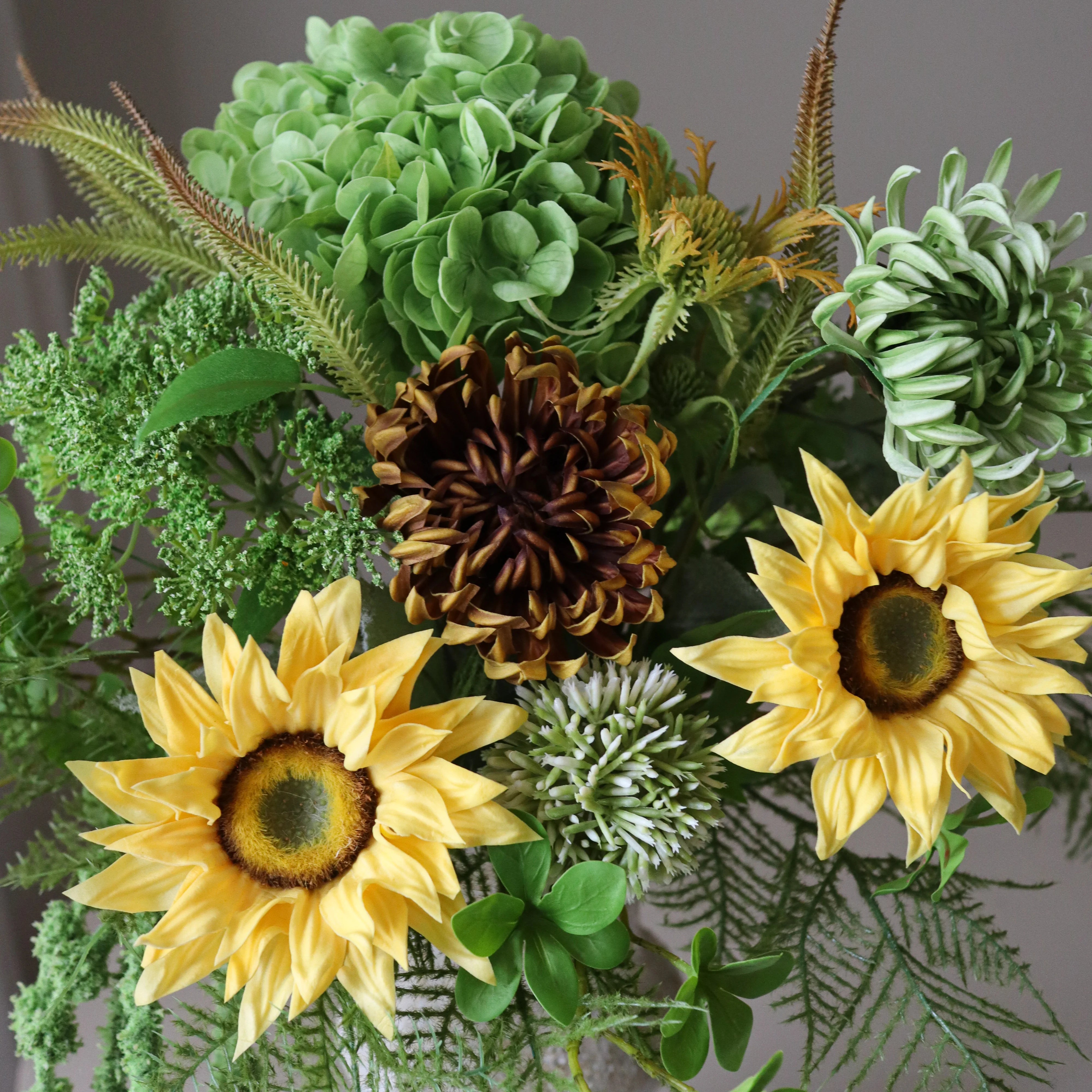 This bouquet showcases a vibrant mix of golden yellow and fresh green tones, accented by bold focal blooms and fine, feathery foliage. Structured elements are softened by airy textures and gentle movement, resulting in a composition that feels lively yet well balanced.