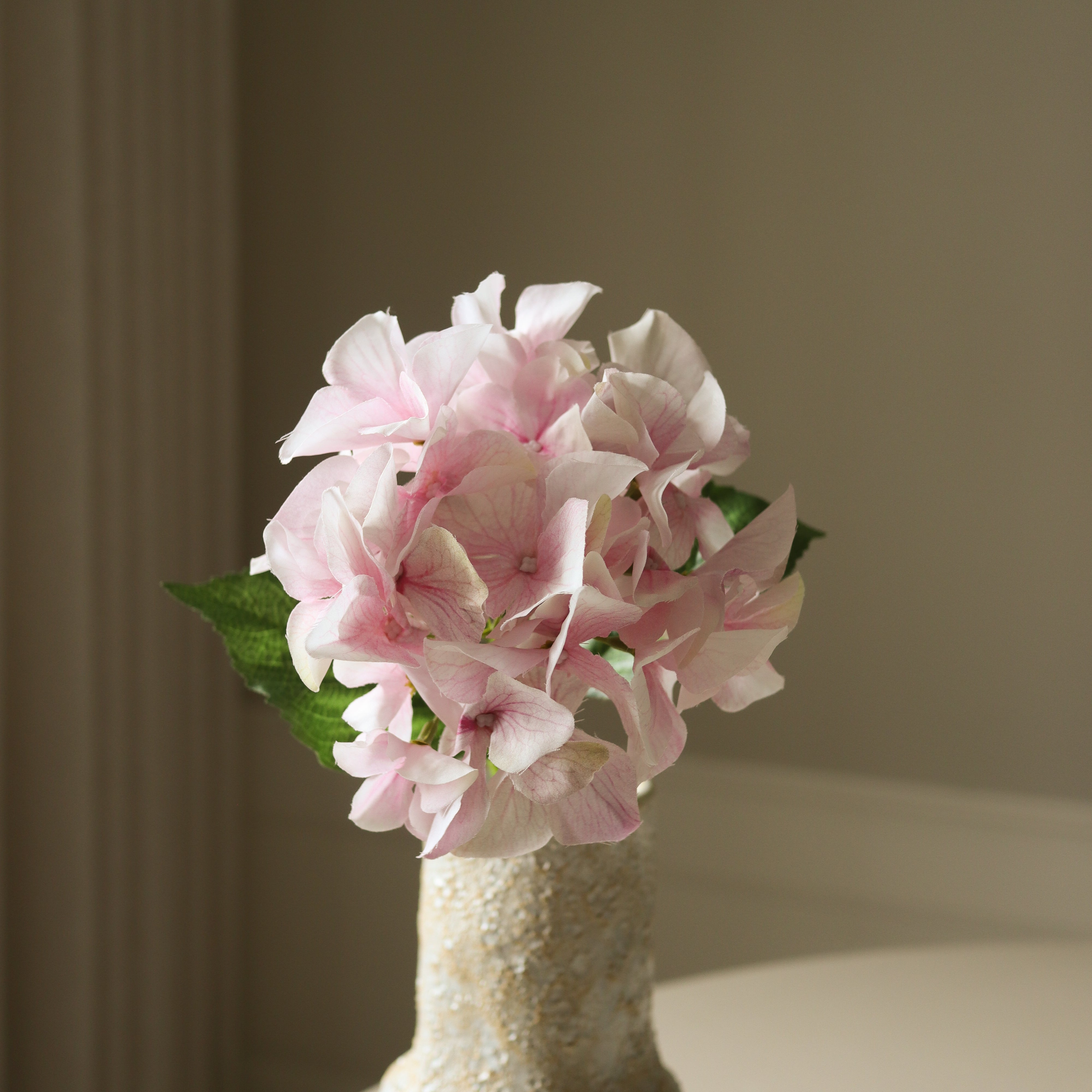 This Light Pink Hydrangea Macrophylla Flower features soft petals in a delicate pastel pink hue with subtle variations in tone. The clustered blossoms form a rounded shape, accompanied by a few deep green leaves. The bloom is supported by a slender green stem, which measures 36 cm in height.