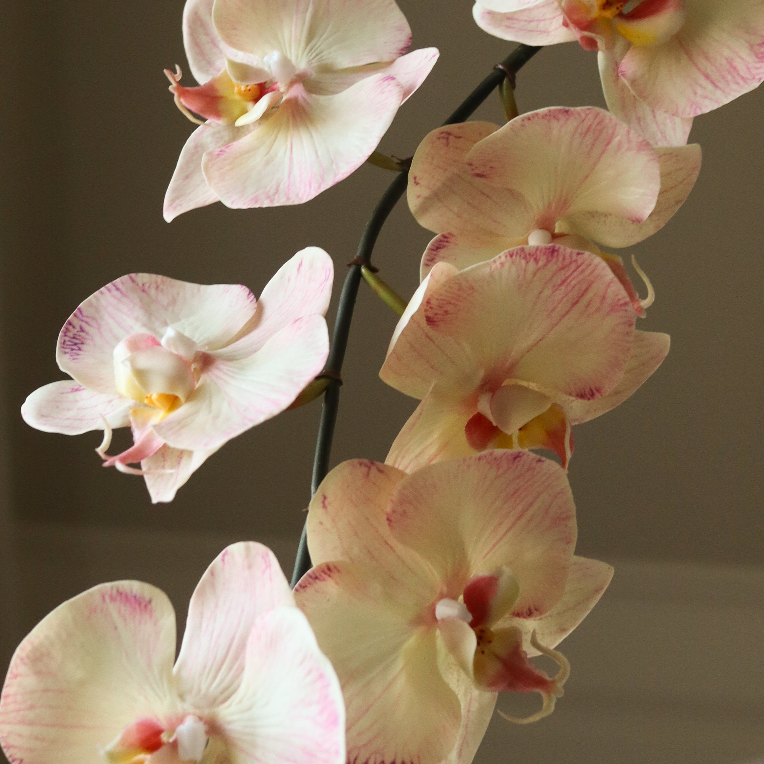 This Light Pink Large Orchid Flower features multiple blossoms with delicate petals in a soft pink hue, accented by subtle magenta streaks and a warm yellow center. The blossoms are arranged along a gracefully arching stem, which measures 90 cm in height.
