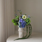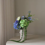 This bouquet showcases a cool palette of soft blue, fresh green, and pale ivory tones, brought together through layered blooms and sculptural forms. Airy florals are balanced with textured elements and cascading accents, creating a composition that feels calm, dimensional, and gently expressive.