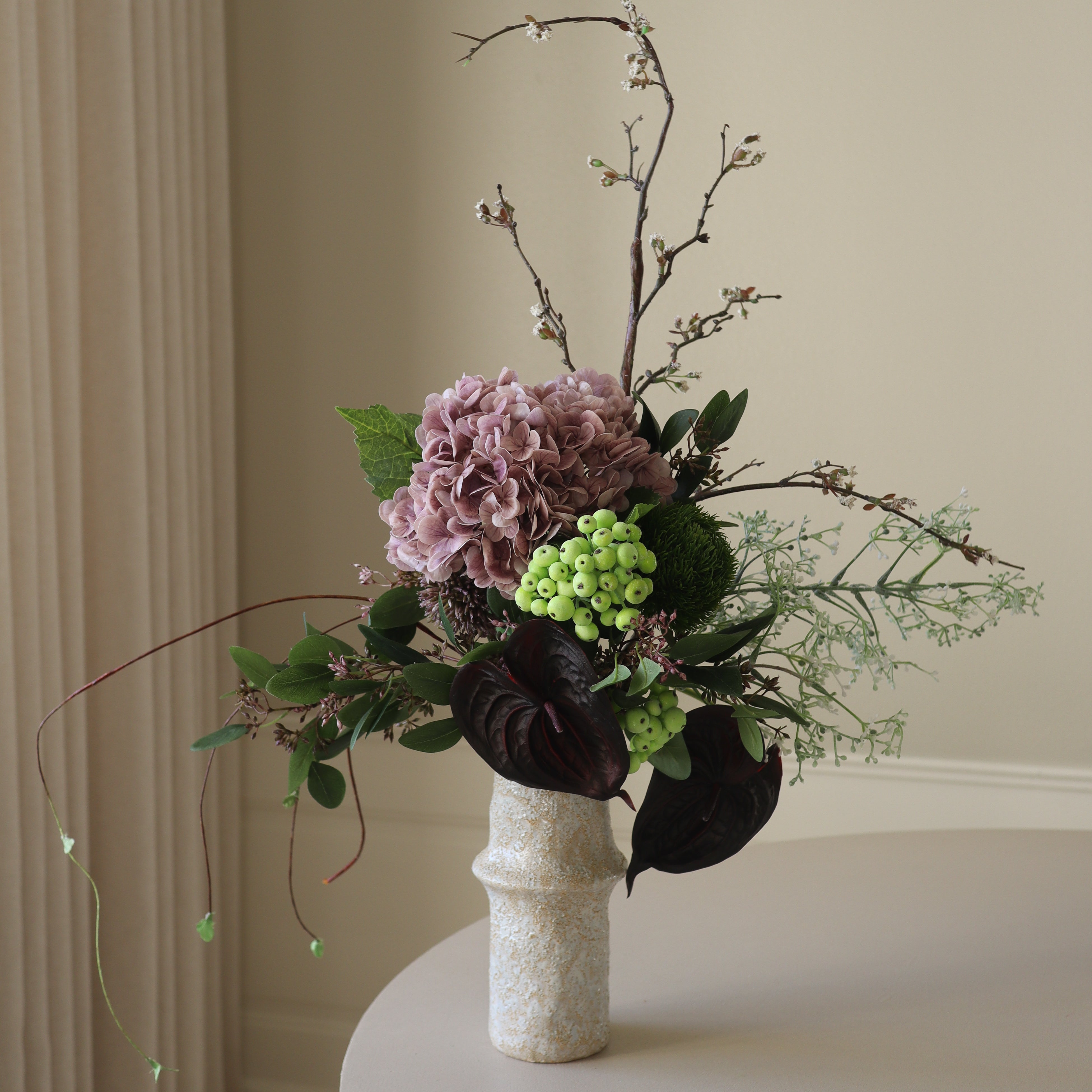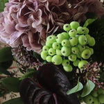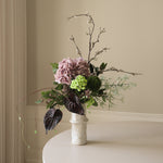 This arrangement blends deep purples, rich greens, and dark accents, creating a bold yet sophisticated composition. The lush hydrangea and delicate blossoms contrast beautifully with the structured, sculptural elements, while the cascading textures add movement and depth. The interplay of dark and vibrant tones evokes a mysterious and elegant atmosphere, making this bouquet a striking statement piece for any space.