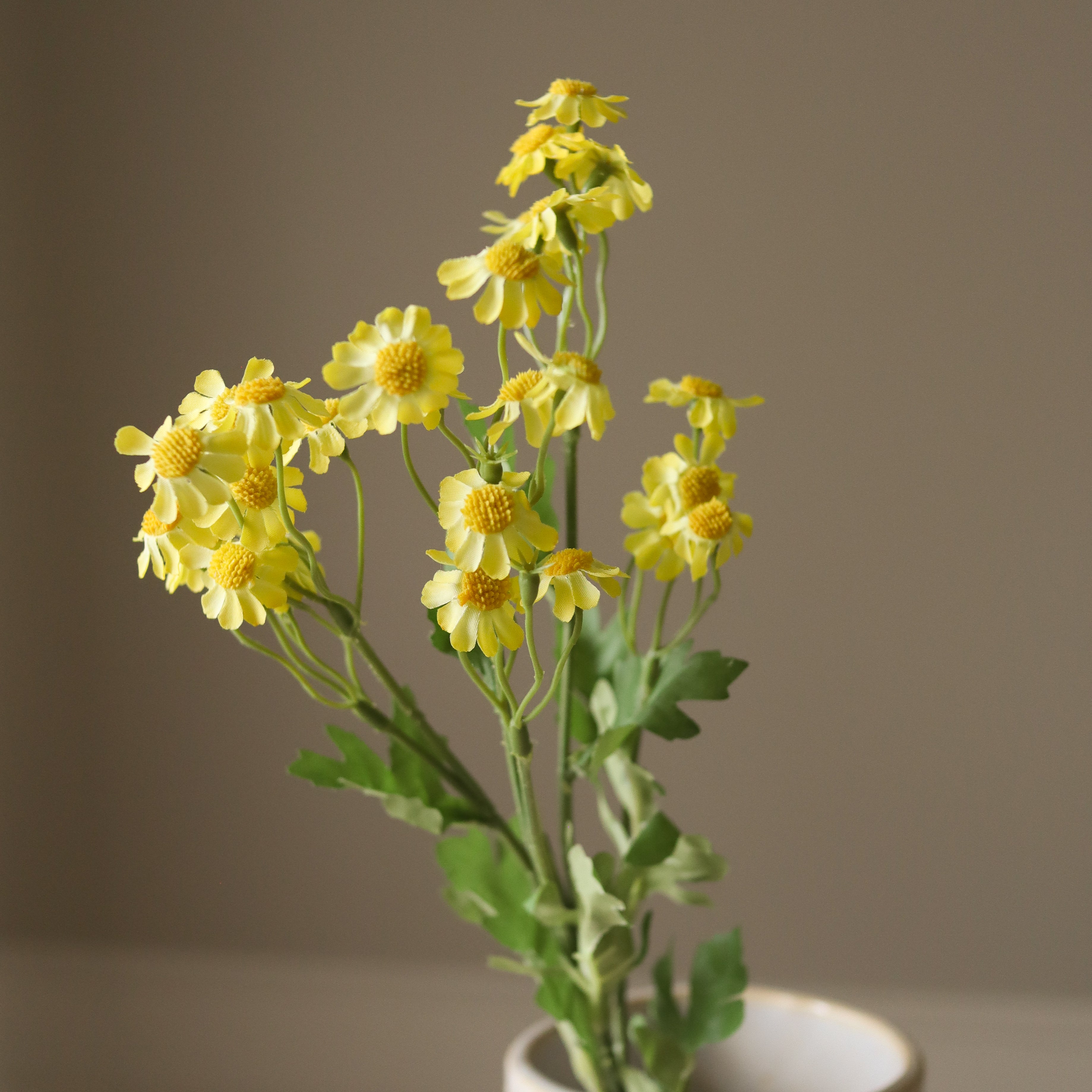 This Yellow Small Daisy Flower features multiple delicate blooms with soft, pale yellow petals and vibrant textured centers. The blossoms are arranged on slender, textured green stems, which measure 53 cm in height, with scattered, slightly serrated green leaves.
