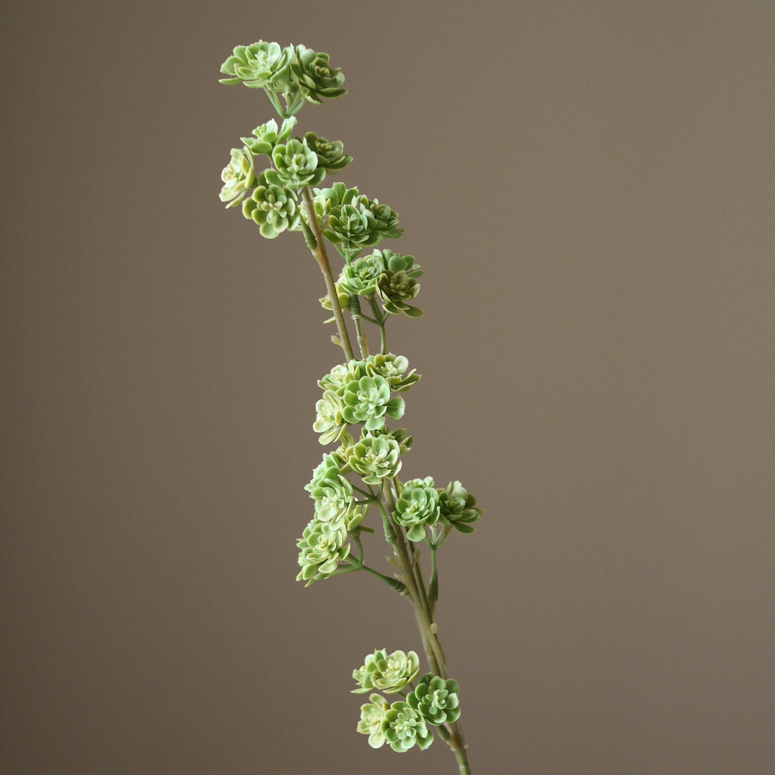 This Light Green Succulent Stem features clusters of small, rosette-shaped leaves in a muted green hue, arranged along a slender, branching structure. The leaves have a slightly waxy texture with delicate curled edges, giving them a natural, sculptural appearance. The stem is thin and pale green, with subtle nodes that add to its organic form. The stem reaches a height of 61 cm.